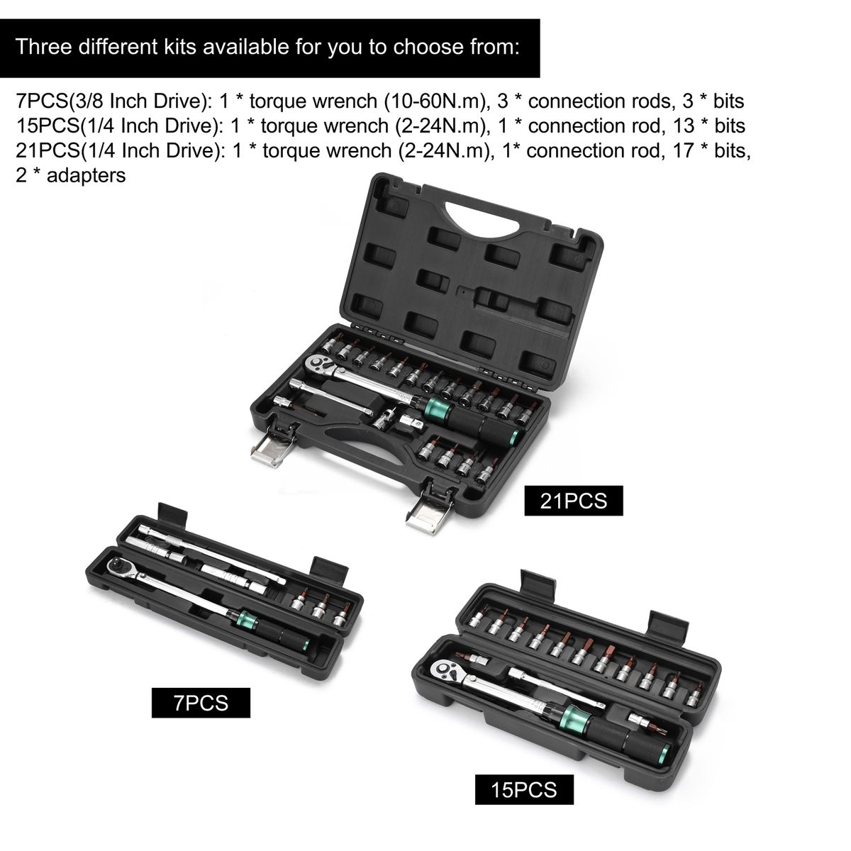 7PCS (3/8 Inch Drive): 1 * torque wrench (10-60N.m), 3 * connection rods, 3 * bits