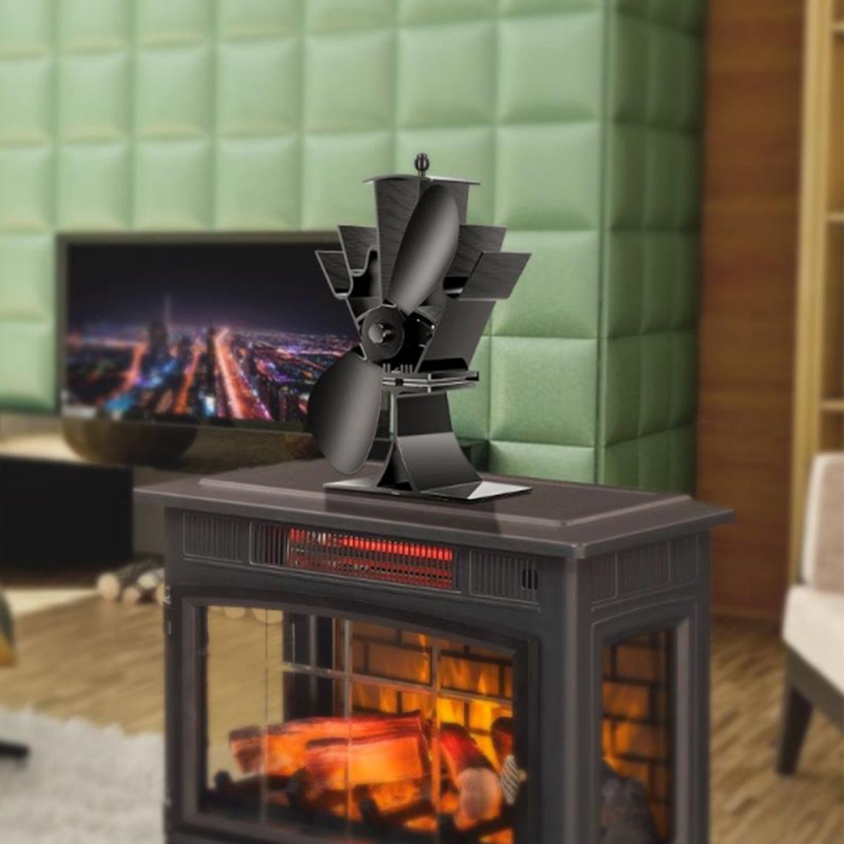 The device will spread warm air throughout the room. We recommend that you place the stove fan at least 4 quot;away from the stove. The fan is driven by the heat of the stove. It can be used on any surface of a pellet stove, wood stove, stove, fireplace, wood fireplace, stove heater, mini fireplace or flat furnace.