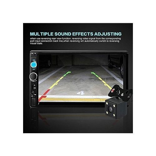 2 DIN MP5 player, with USB, SD, Bluetooth, Aux., and FM radio with 190 degree Rear view camera. It is a screen touch device. Has remote control. It is suitable for must cars, ranging from Toyota Camry 2000 - 2005, Toyota Corolla 2001 - 2005, Honda models from 2000 - 2004, Volkswagen Passat 2006 - 2008 etc.