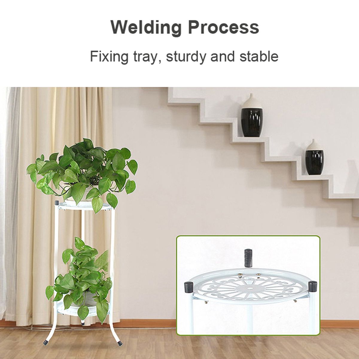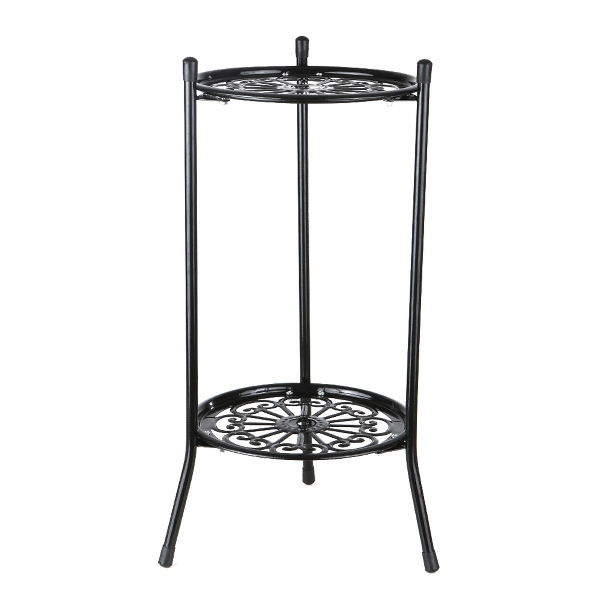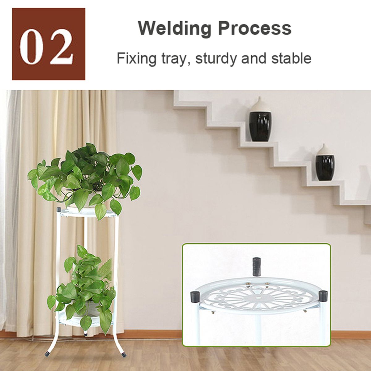 The pot stand is 2 layers to put flower pots to display your plants at garden, deck or patio. Metal material, it is durable to use.