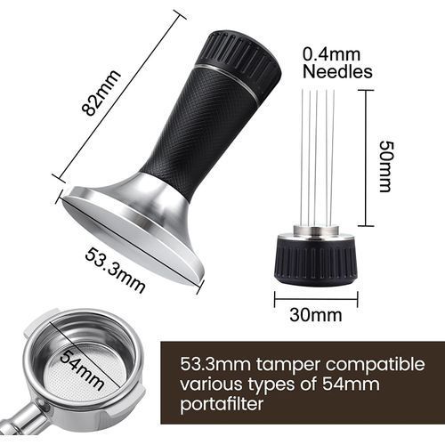 - 【2 in 1 Coffee Tamper and Stirrer】 This espresso tamper include 1 tamper espresso 53mm and 1 stirrer, you can have both functions in one purchase. Break up the clumps with the espresso distribution tool and then tamping the coffee by espresso hand tampers.