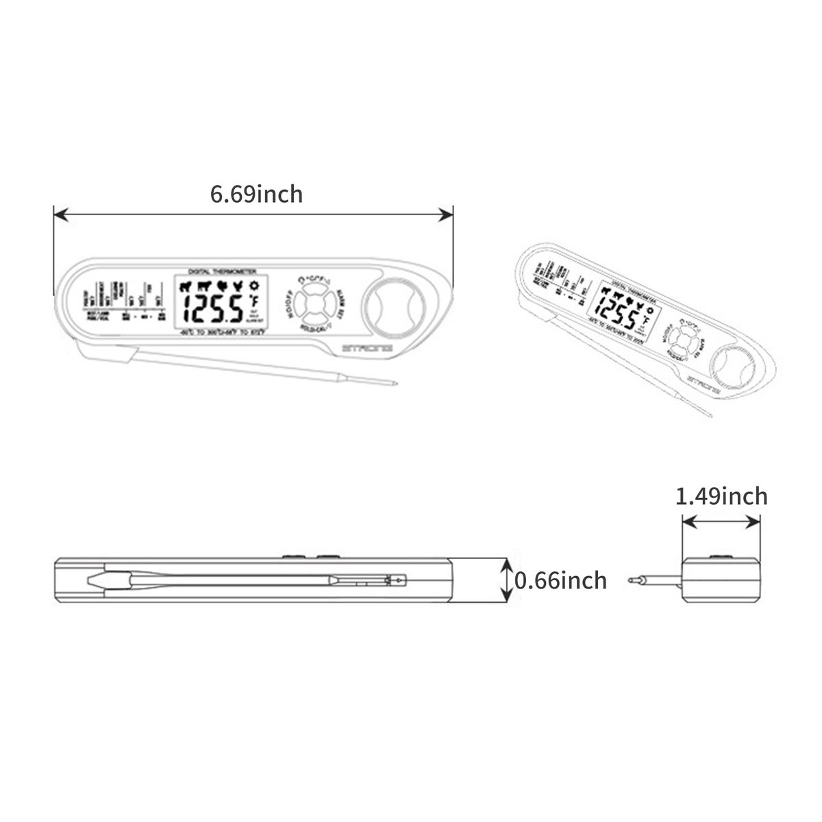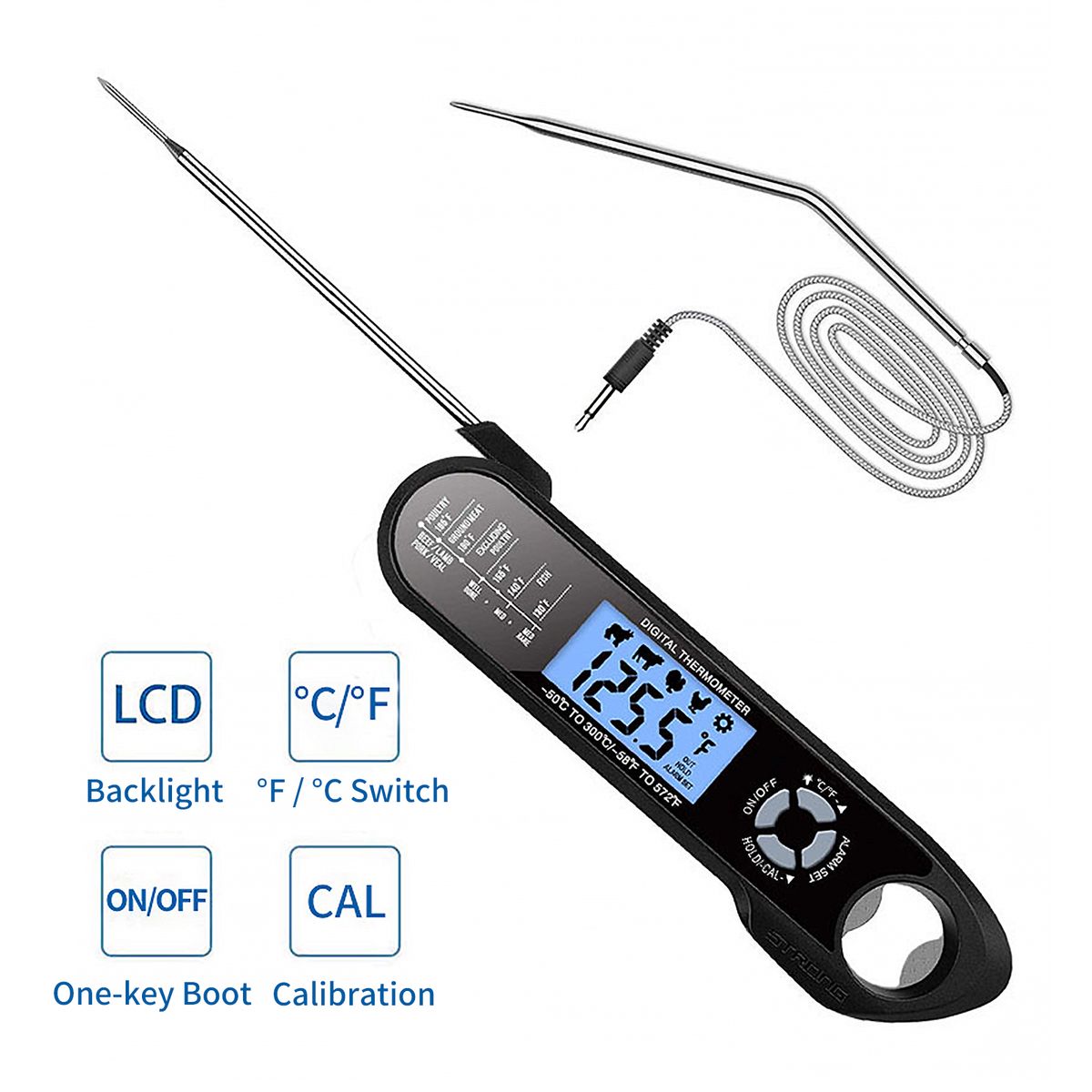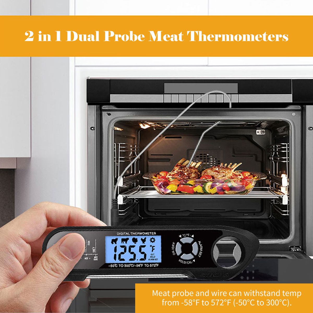 Dual probe instant-read food thermometers have a long wire that you can track the meat thermometer from the machine outside, while the original probe can only measure the food after taking it out from the machine. Meat probe and wire can withstand temp from -58 deg;F to 572 deg;F (-50 deg;C to 300 deg;C).