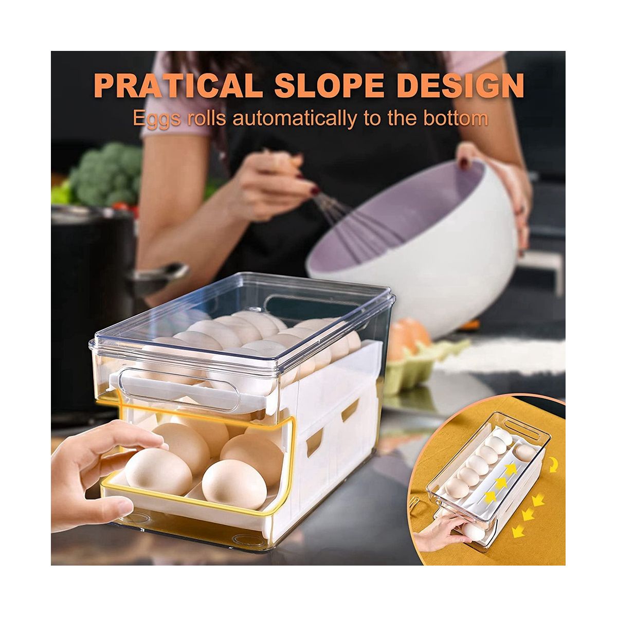[Upgrade 2 in 1 Rolling Egg Holder]Egg container combines a 2 tier rolling egg holder with a orgnizer bin, allow egg roll down automaticlly and safety, convenient to get eggs without any serious maneuvering and give priority to using eggs that have been stored for a period of time, keeping the eggs in the egg rack