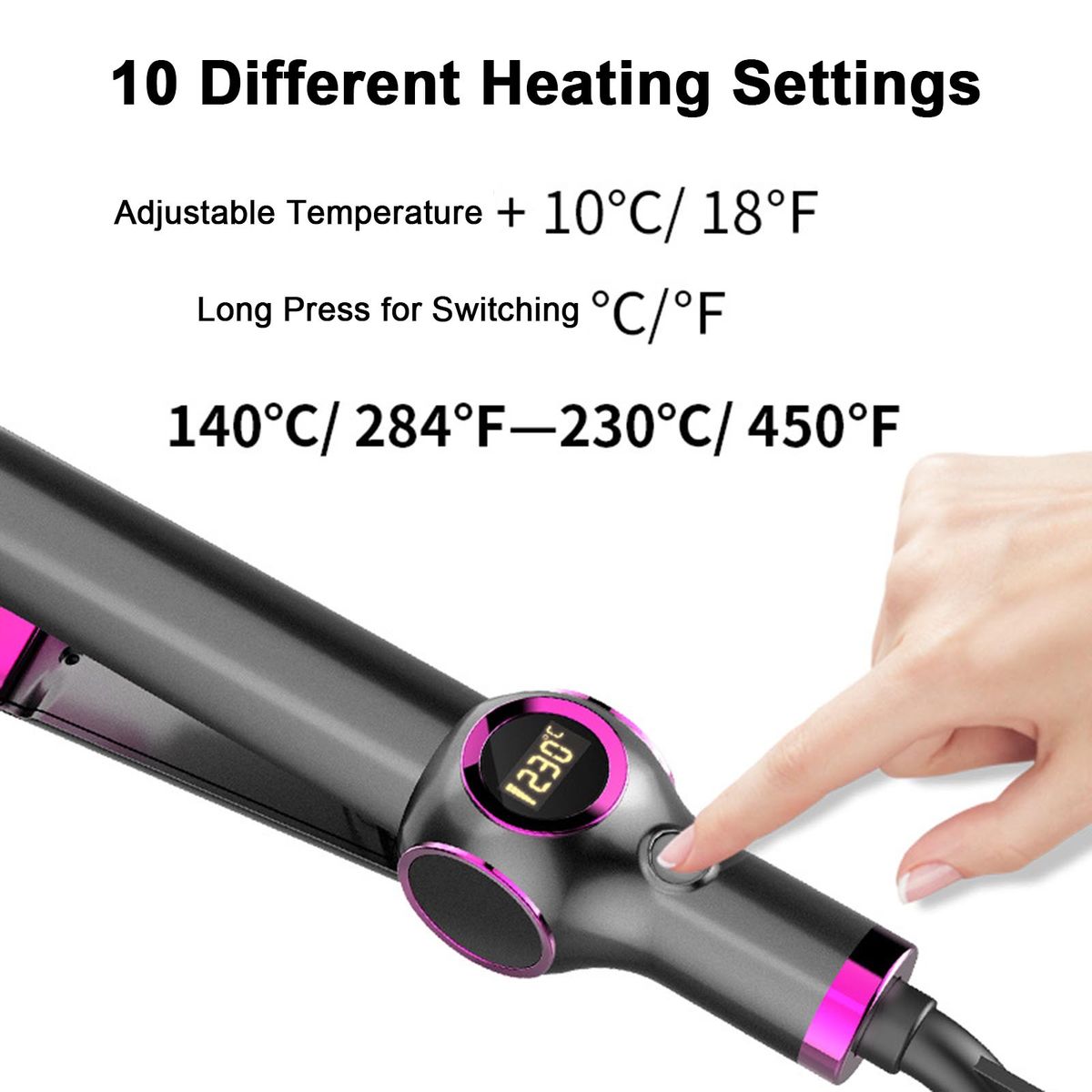 10 Different heating settings, fast to be heated up within 30s, its temperature can be adjusted from 140℃ to 230℃ and the temperature unit can switch from ℃ to deg;F.