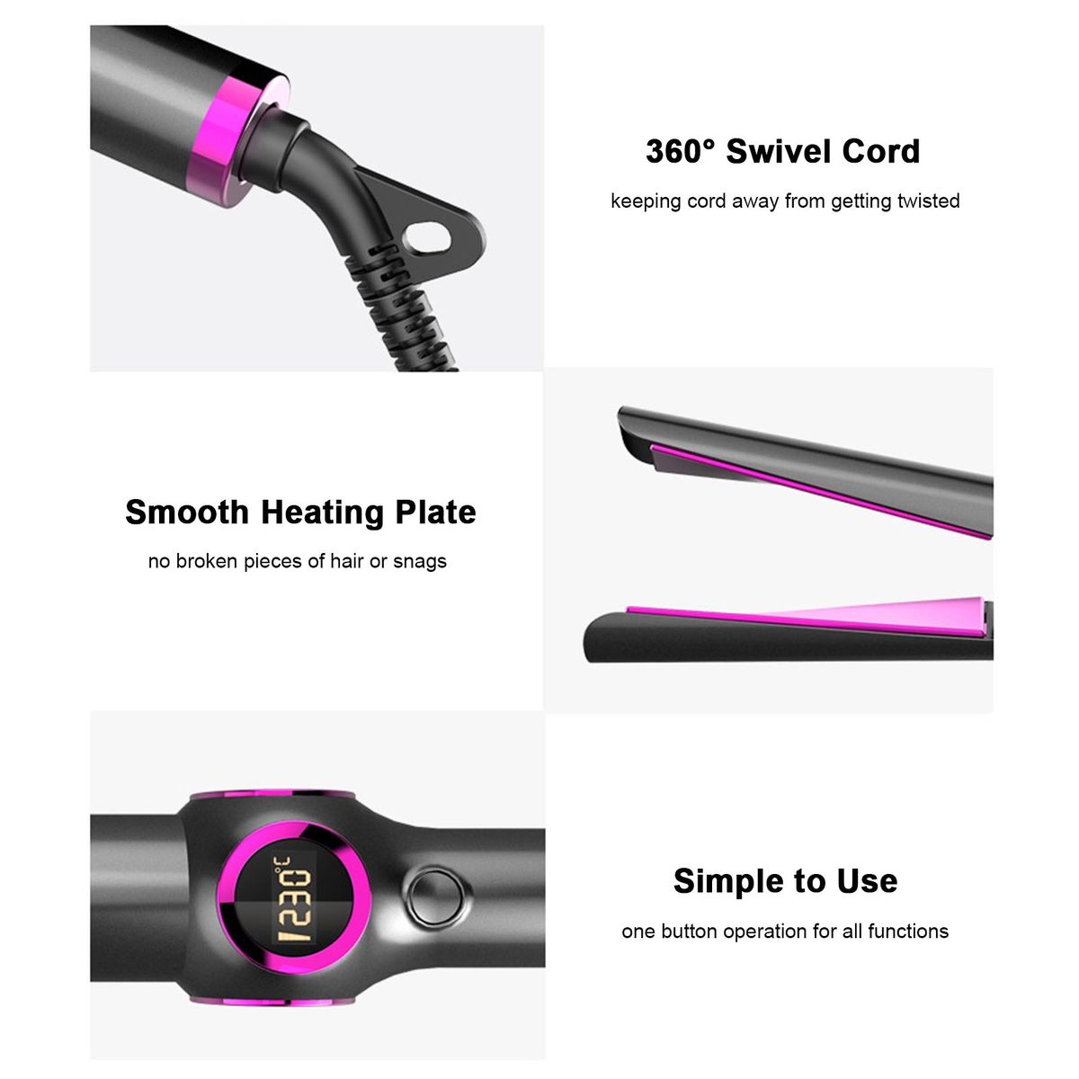 Anti-scald design, thanks to the barrels with rounded edges and the 9.5cm-long and smooth plate, this flat iron is great for both straightening and curling hair without broken pieces of hair or snags.