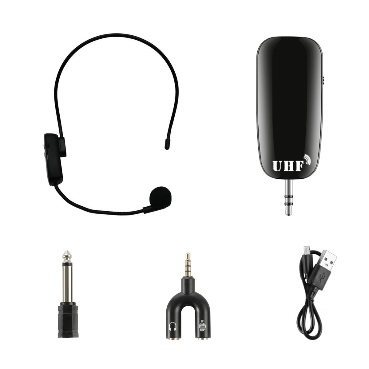 1 x UHF Wireless Microphone,1 x Receiver,1 x USB Cable,1 x 3.5mm Audio & Mic Adapter,1 x 3.5mm to 6.5mm Adapter,1 x Cable