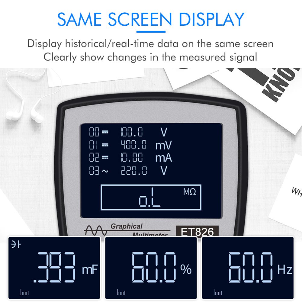 Digital multimeter with 200K high-speed A/D sampling, 4000 counts auto-range, one-button switch of graphical waveform display during measurement.
