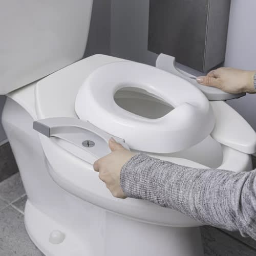 POTTY RING: Simply extend the legs outward and click them into place to use this travel potty seat on toilets in public restrooms, on visits, or at home. The integrated handles provide stability.