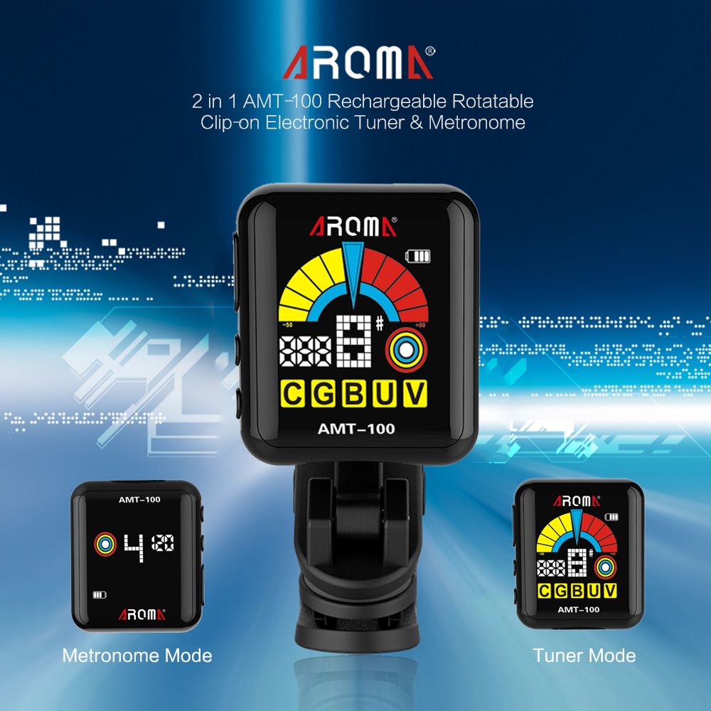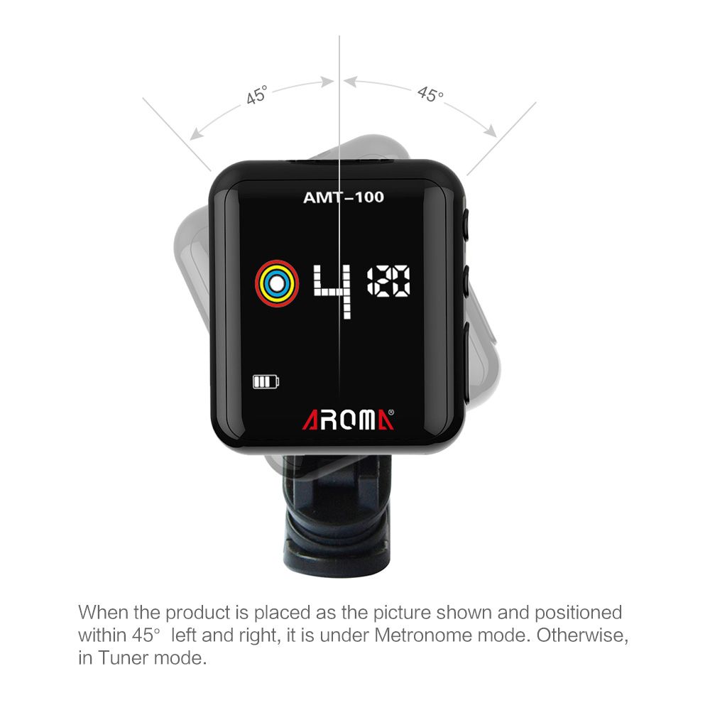 AMT-100 rechargeable clip-on tuner/ metronome for chromatic/ guitar/ bass/ ukulele/ violin, has a unique function of rotary to switch modes automatically.