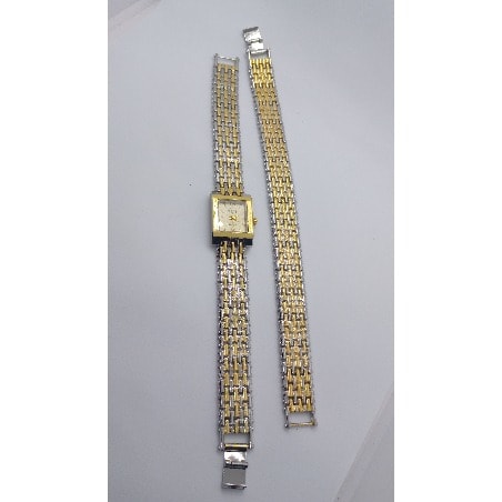 Tapered polished gold-tone stainless steel with adjustable links and jewelry-clasp,d polished gold-tone stainless steel rectangular case, Polished gold-tone steel crown, Stainless steel caseback, two tone watch.