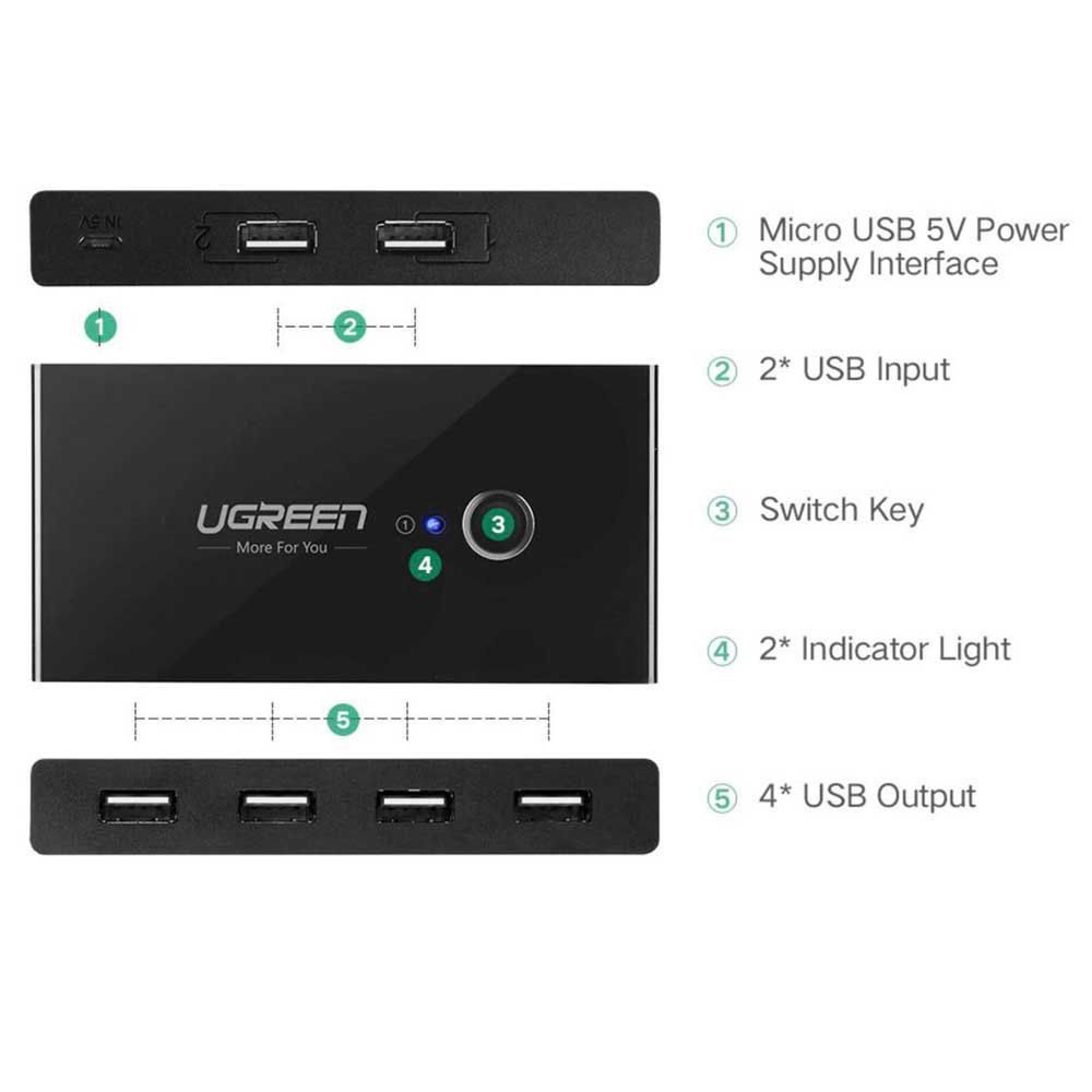 This USB Switch 4 Port device allows up to 2 users to share 4 USB 3.0 peripheral devices, such as a printer, scanner, mouse, keyboard or USB disk, etc without the need to constantly swap cables or set up complicated network sharing software. It's great for use at home if you have multiple PCs or Macs.