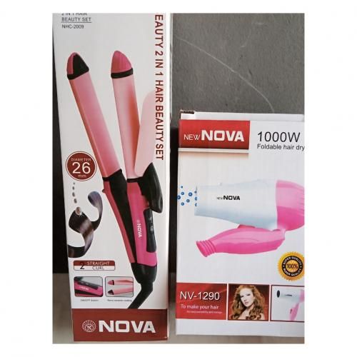 : Nova 2-in-1 Hair Curler and Straightener Beauty Set has a compact design and this makes it ideal as your traveling companion. You will always look beautiful no matter where you find yourself. It will fit perfectly in to your travelling bag or handbag, which makes it convenient for you to style your hair as you wish. This curler and straightener has a ceramic coated plates and rubberized grips for easy handling. It is suitable for all kinds of hair and it has an overheat protection for coloured hair.HAIR DRYER: Comfortable and nice outer designEasy to handleDual function switchPower cord lengthProfessional hair dryerDurable multi-step switchNova 2-in-1 Hair Curler and Straightener with comb Beauty Set have a compact design and this makes it ideal as your travelling companion. It will fit perfectly in your travelling bag or handbag, which makes it convenient for you to style your hair as you please. It has ceramic coated plates and rubberized grips for easy handling. It is suitable for all kinds of hair and it has a overheat protection for coloured hair. The Hair Dryer is easy to use and provides safe operation. Designed for daily use, this dryer will give you the best of styling. It has an ergonomic design that will easily fit into your hand, and it looks good too. Nova Hair Dryer is perfect for those looking for a hairdryer that allows you to dry your hair easily and efficiently. You can use it daily to ensure that your hair looks shiny and feels smooth.Rotating power cord2 in 1 multifunctional perfect curlPower switchFoldable mini hair dryer Get the Nova Foldable High Grade Mini Hair Dryer that is ideal for grooming on-the-go. Being a compact hair dryer, it takes little space in your cabinet and can be taken when you travel as well. The handle of the dryer folds up which makes it compact and takes little space in your travel bag. The travel hair dryer has 2 hot speed settings to cater for your hair typeGet the Nova Foldable High Grade Mini Hair Dryer that is ideal for grooming on-the-go. Being a compact hair dryer, it takes little space in your cabinet and can be taken when you travel as well. The handle of the dryer folds up which makes it compact and takes little space in your travel bag. The travel hair dryer has 2 hot speed settings to cater for your hair type