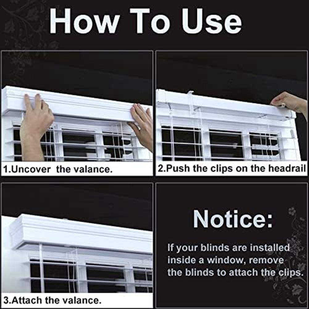 EASY TO INSTALL the window blind clip is easy to install and can be buckled firmly in the track of the blinds splint no drilling is required just the clips into the on the back of the valance then slide the valance over and onto the horizontal rail at the top of your blind