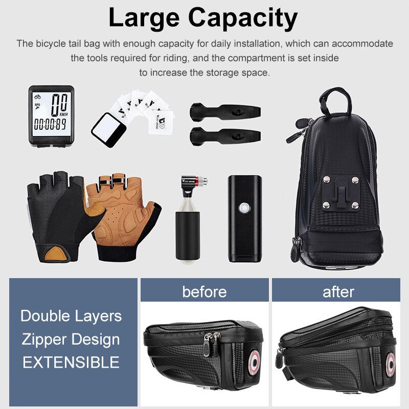 *Large Capacity:The bicycle tail bag with enough capacity for daily installation, which can accommodate the tools required for riding, and the compartment is set inside to increase the storage space.