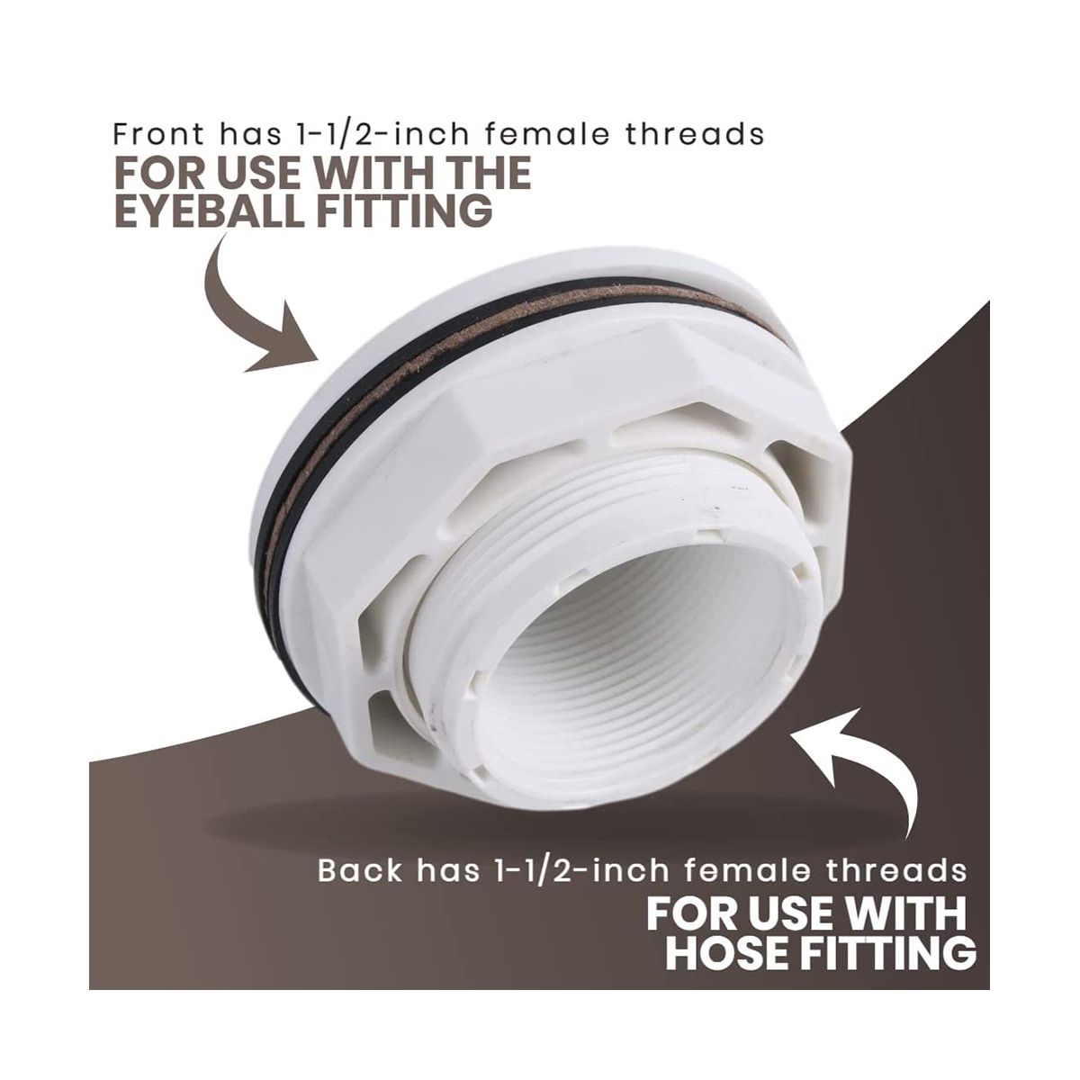 Outlet: With 1.5inch internal threads, this (internal thread) inlet fitting is suitable for use with plugs, outlet covers, directional fittings (eyeball fittings), grate inserts, JetAir hydrotherapy fittings, aftermarket jet nozzles
