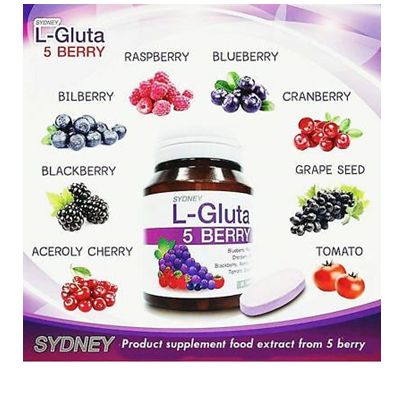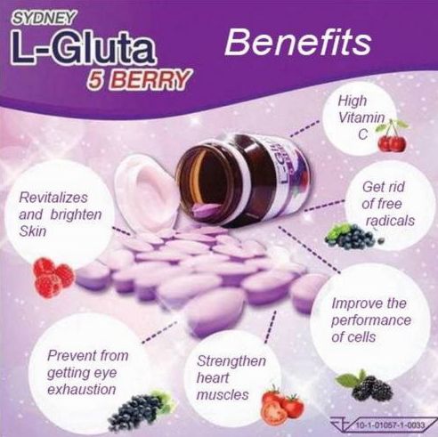 Sydney L-Gluta 5 Berry with L-Glutathione. Is an important amino acid in anti-oxidants. And inhibit the formation of melanin pigment that cause of freckles and dark spots, enriched with extractions of valuable luscious berries from the five types including grape seed and tomato extract. Helps restore skin to look beautiful, smooth and radiant skin, look healthy and younger
