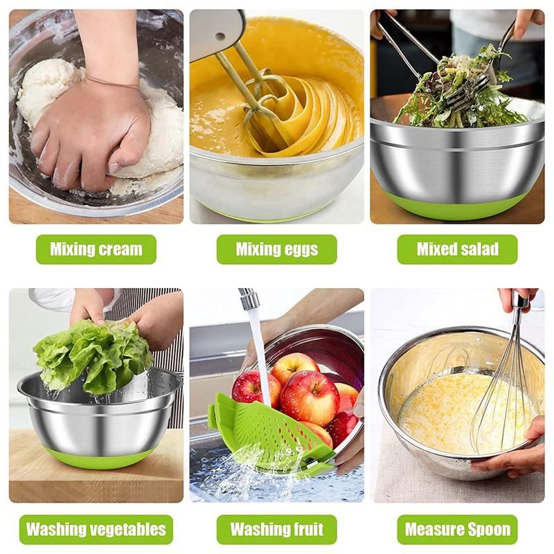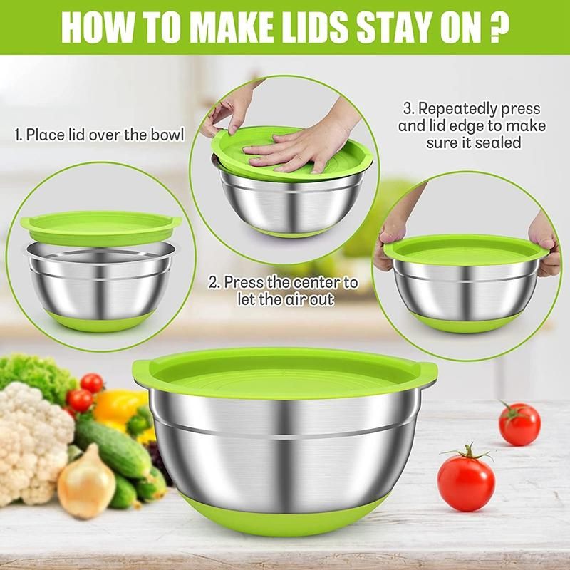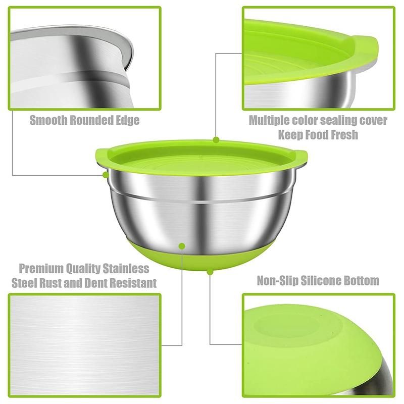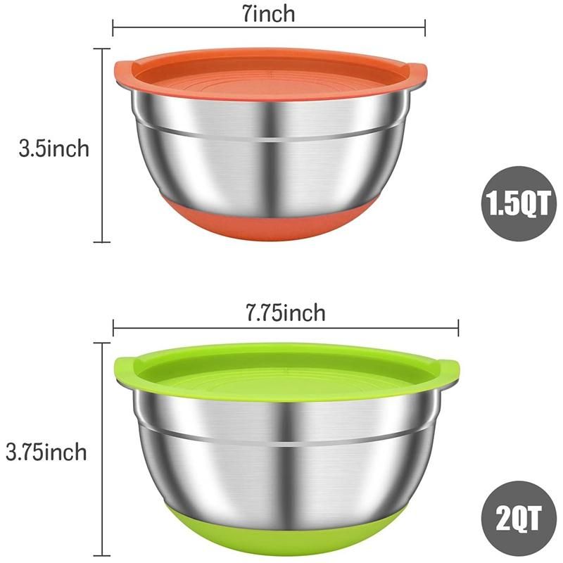 [ AIRTIGHT LIDS AND NON-SLIP SILICON BOTTOM DESIGN ] These mixing bowls with airtight lids are freezer safe, flexible plastic airtight lids closely fit the bowls to keep food fresh and dry. Stainless steel nesting mixing bowls with Lids great for food storage and keeps your food fresh longer in the refrigerator. These exquisite design of the kitchen bowls allows you to fully enjoy kitchen life.