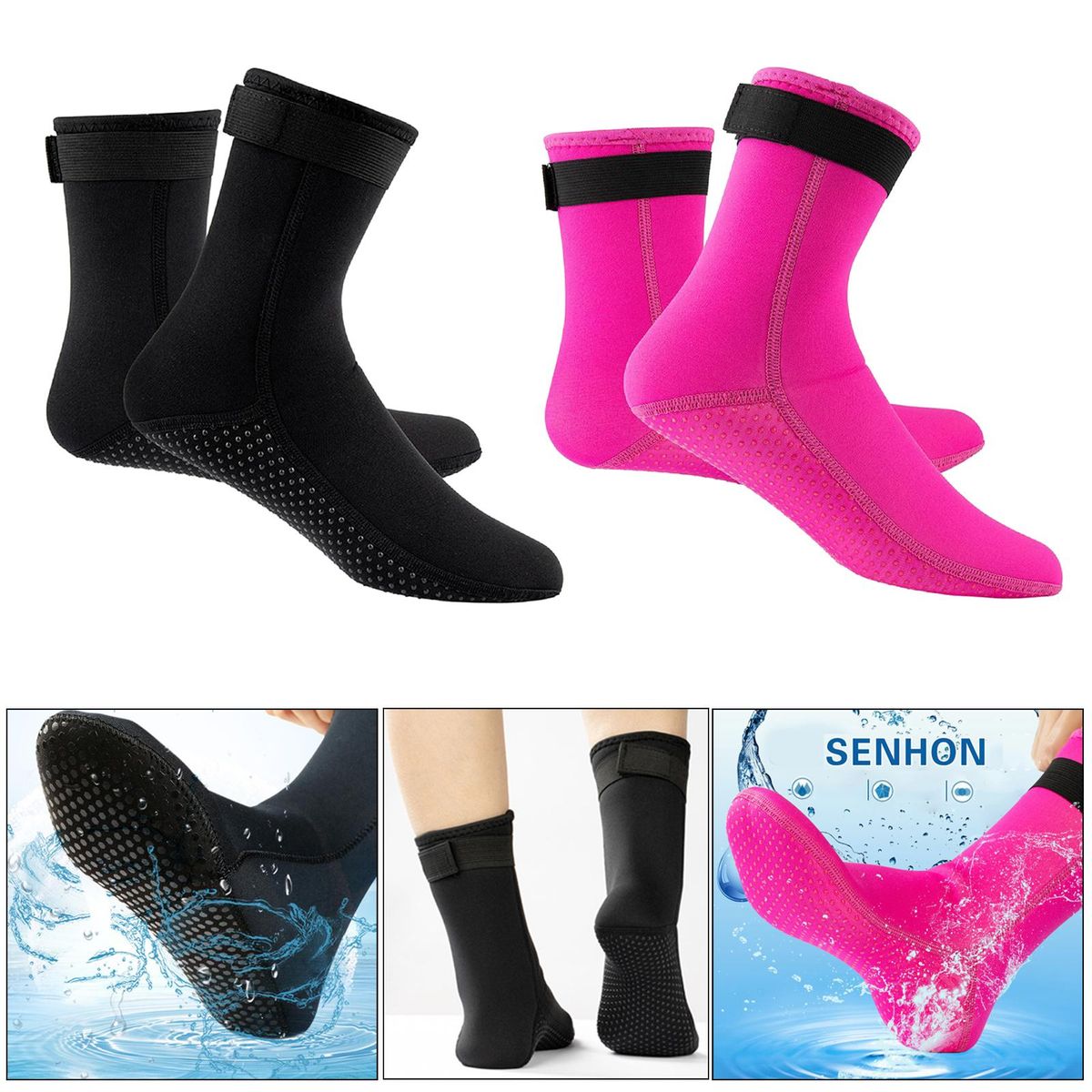2 Pair 3mm neoprene diving scuba surfing swimming socks water sports snorkeling boots.Keep warm, non-slip, elastic and comfortable to wear. Can wear with flippers or alone.Blind stitched seams lay flat on skin, flat seams, stick strap design, fit your ankle.Perfect water sport accessory for protecting your feet from scratch and prick.Suitable for scuba diving, snorkeling, surfing, swimming, boating, beach, water sports, home and more.