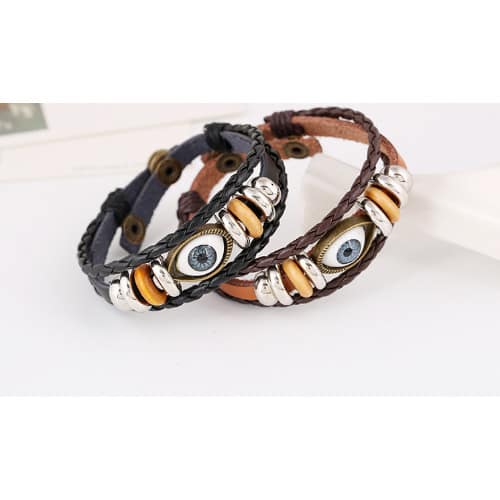 2 Pc Unisex Turkey Blue Eyes Braided Cowhide Bracelet - Black & Brown