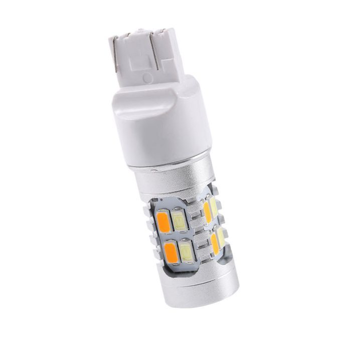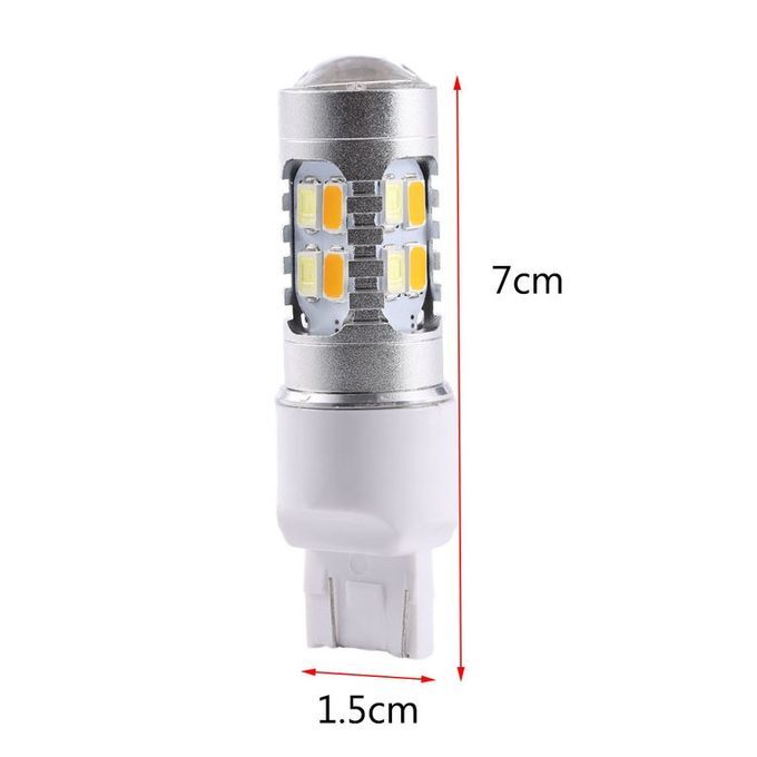 Description: Features:100% and high quality!Best used for front turn signal lights w/ dual functions as parking lights(DRL) and turn signal lights.Because of this new design and high power LED technology, this kind of SMD LED switchback bulbs will be much brighter than other SMD LED switchback bulbs on the market!Specifications:Voltage: 10-30VLED Color: White & AmberPlug type: T20Led Type: 5630 SMDDriving Mode: White (10 pieces of white 5630-SMD chips)Turn Light Mode: Amber (10 pieces of amber 5630-SMD chips)Length: 7cmDiameter: 1.75cmColor temperature: 3000K (amber light) / 6000K (white light)Single size: 7xφ1.8cmPackage Includes:2 X 10-30V DC 5630 20Led Dual Color Switchback Light