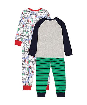 handy pack of 2 pairs of pyjamasfun prints of vehicles and roadselasticated waistband for a great fitribbed cuffs and neck for comfort