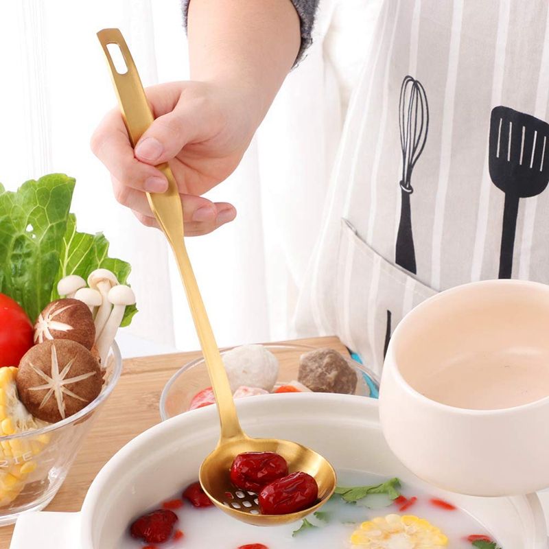 1X 2 Pieces Gold Metal Soup Ladle Colander Set, Long Handle Stainless Steel Kitchenware Cookware Serving Spoon Cooking Utensil For