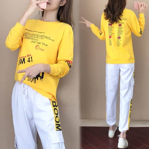 The set contains one long sleeve T shirt and a cargo/combat pants. Made of polyester and cotton.. The set would make you look chic and fashionable