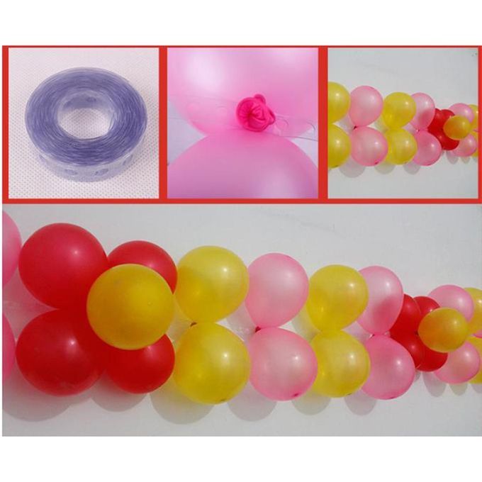 2 rolls 5 meters/each long plastic strip with small sturdy holes to hold inflated balloon knots in place - reusable and easy to use.