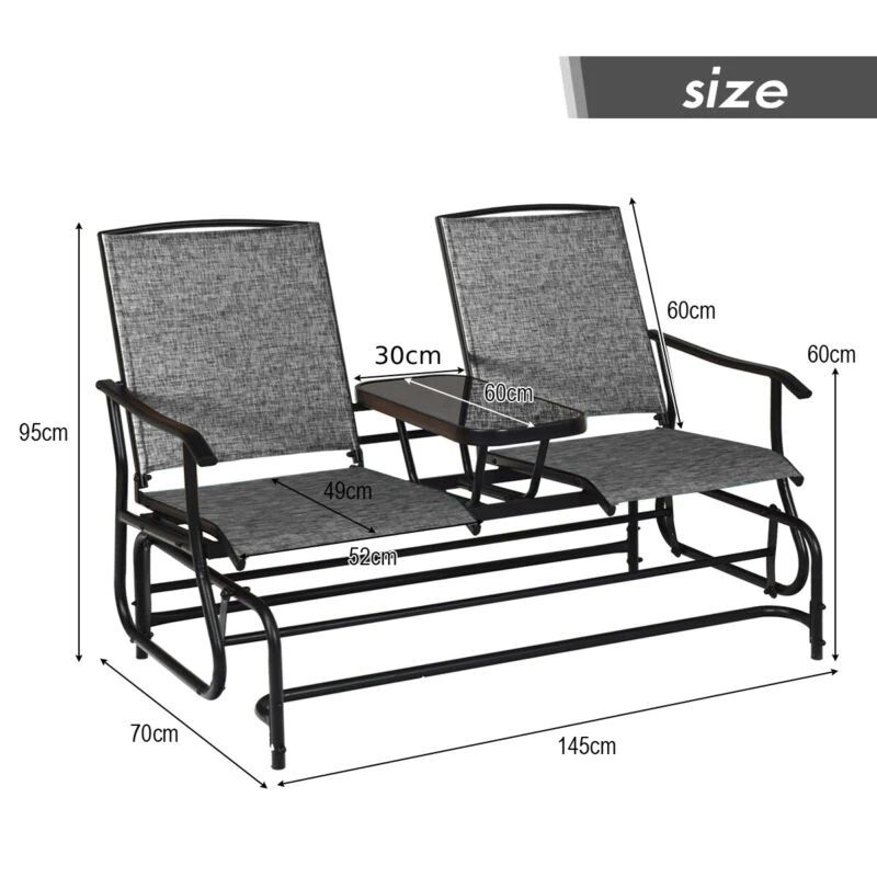 - Outdoor Glider Bench with Center Table, Metal Frame Patio Loveseat with Breathable Mesh Fabric and Armrests for Backyard Garden Porch, Gray
