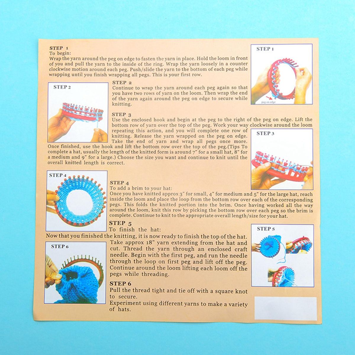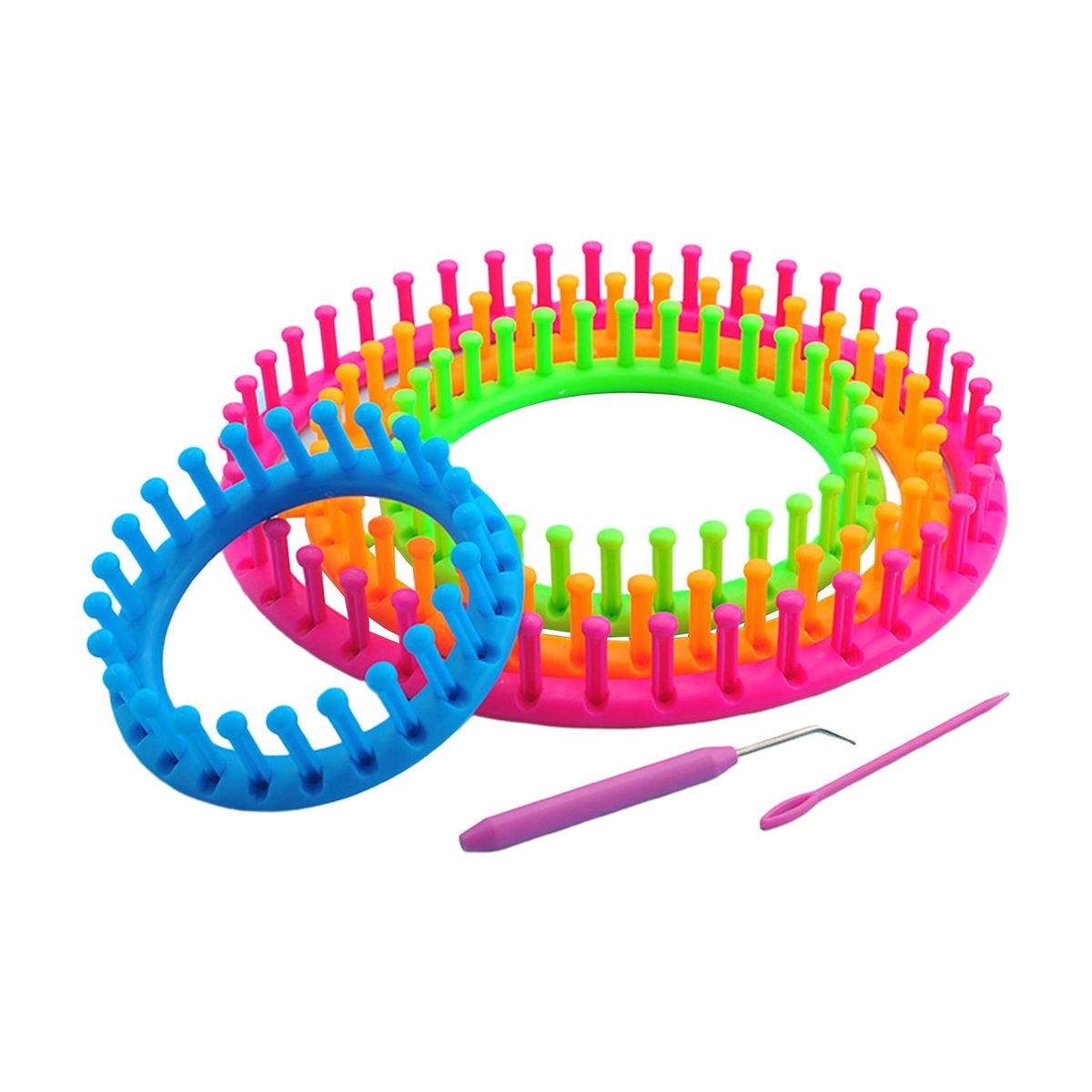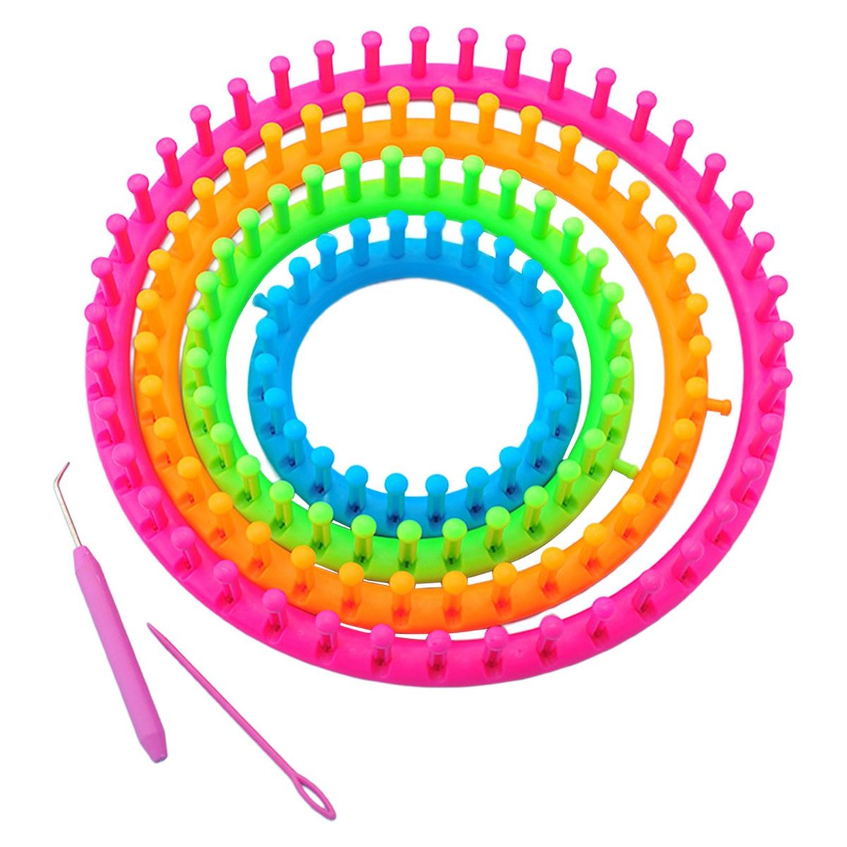 Round knitting looms Set includes 4 sizes looms, one yarn , one loom oick, one english instructions.The knitting loom are sturdy and made to last. They come in bright neon colors with small anchor pegs . It can be knitted in patterns once you get it.They are lightweight, easy to use and hold, making them a great choice for knitting beginners. With sharp crochet hook, great efficient in knitting.Made from smooth plastic to allow the wool or yarn to slide over the peg with ease. Perfect quick knit loom for quickly and easily creating scarves, booties, hats, bags, & much more.