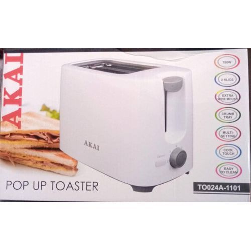 toaster with wide mouth slots for easy access. 7 browning level. comes with cancel button. Automatic ejection at completion.cool touch body. Removable crumb tray for easy cleaning AKAI 2 slice