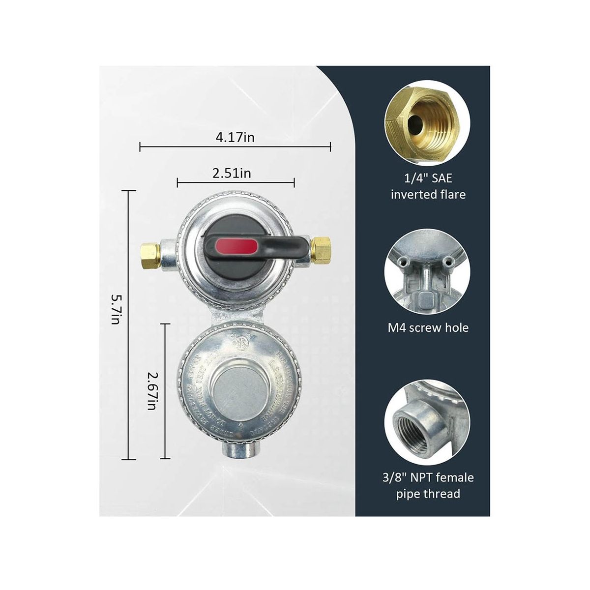 [Specification & Material]RV Propane Regulator: Inlets are 1/4inch SAE Inverted Flare, Outlet is 3/8inchinch Female NPT, Primary Cylinder Capacity 210, 000 BTU/, Reserve Cylinder 130, 000 BTU/.