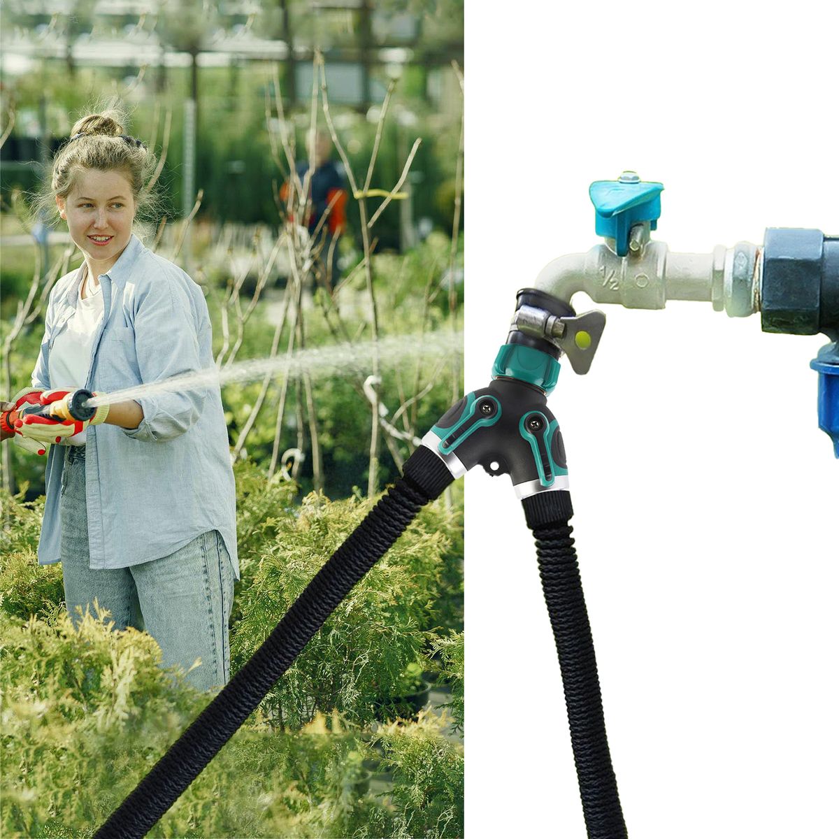 [Easy to Use]Just rotate the 2-way hose connector and twist the faucet and spin the switches to easily open or close the valves.