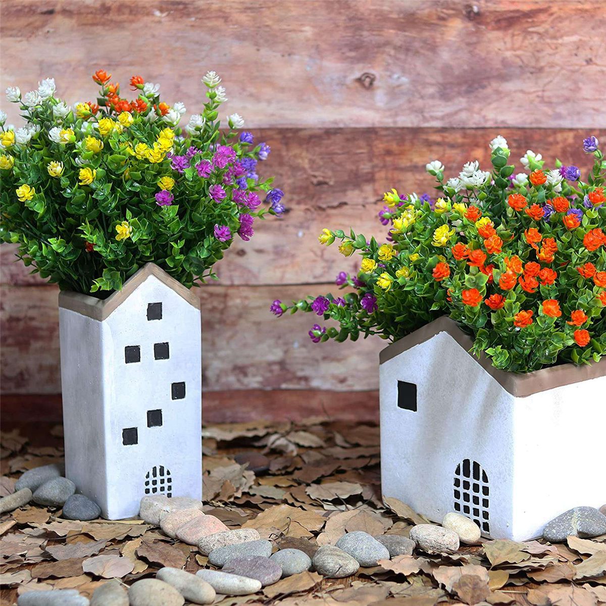 FAUX IS THE NEW FRESHTransform your porch into a vibrant display of color with these UV-resistant artificial flowers Available in bright shades of yellow orange purple fuchsia and white Our lifelike faux flowers are perfect for any landscaping project or decor style Abandon the traditional plastic flower heads those with a single color and fade quickly you can keep fresh and beautiful year after year