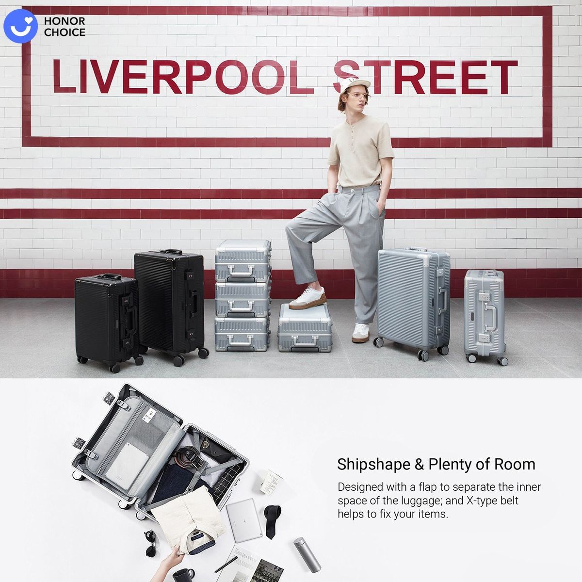 [Shipshape] Designed with a flap to separate the inner space of the luggage; and X-type belt helps to fix your s.