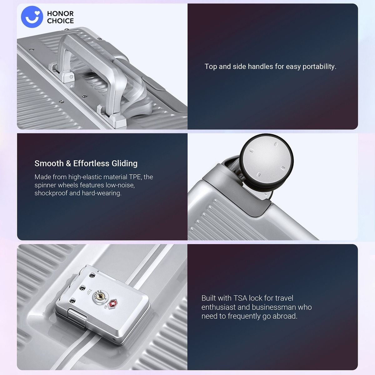 [Flexible amp; Quiet] Made from high-elastic material TPE, the spinner wheels features low-noise, shockproof and hard-wearing.
