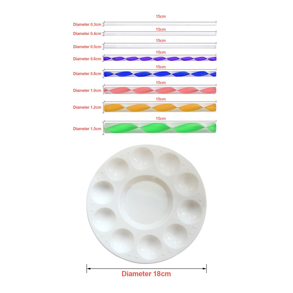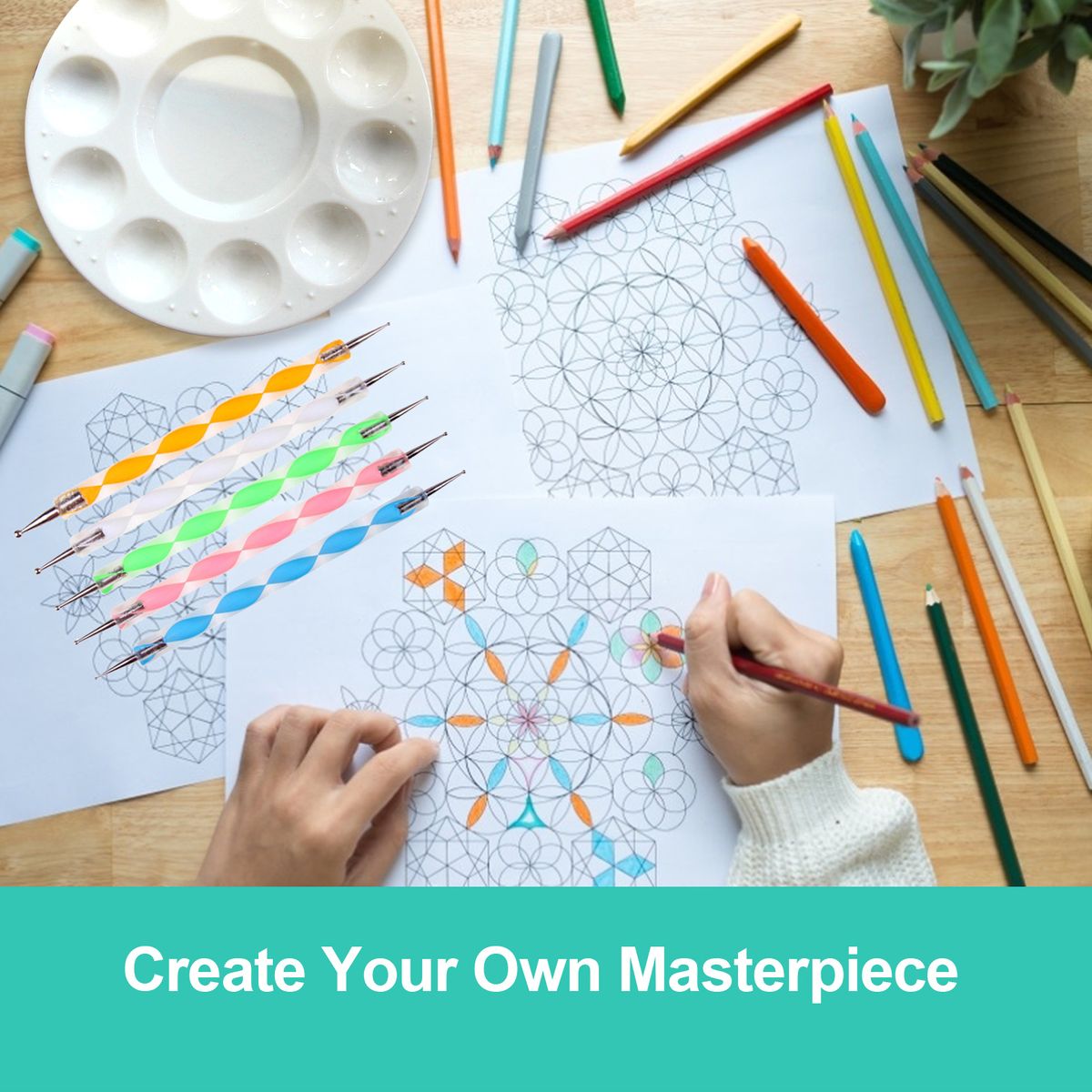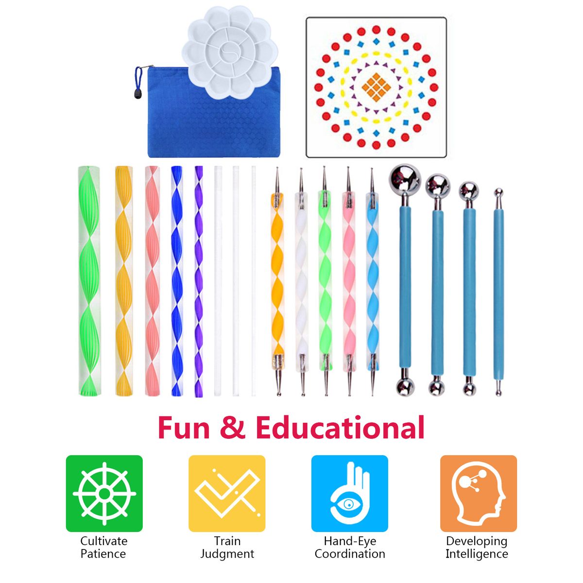 This mandala dotting tool kit including 1pcs stencils, 1pcs palette, 1pcs storage bag, 4pcs double ended ball stylus pens, 5pcs double-head silicone embossed dotting stylus and 8pcs acrylic rods(5pcs colored rods and 3pcs transparent rods).