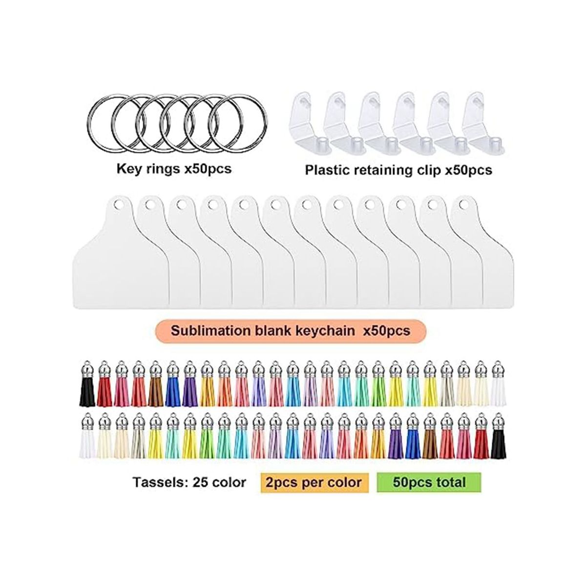 Complete Keychain Set: you will get 50 pieces of sublimation blanks, 50 pieces of leather tassels in 25 kinds of colors, 50 pieces of jump rings and 50 pieces of plastic buckles, nice for adding your favorite photos, logos, quotes, and designs on these blank keychains, ensuring that your gift stands out and reflects your personal touch for your friends, family and loved ones