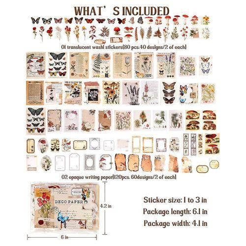 The following is the detailed introduction about our products: SCRAPBOOK STICKERS KIT: 200 pieces of assorted paper and sticker, includes 2 different styles of material, 120 pieces of junk journal matte writing paper and 80 pieces of translucent washi stickers. A great collection of all sorts of vintage-inspired junk magazine goodies! Enough to meet your various decoration needs, or to share with family and friends.