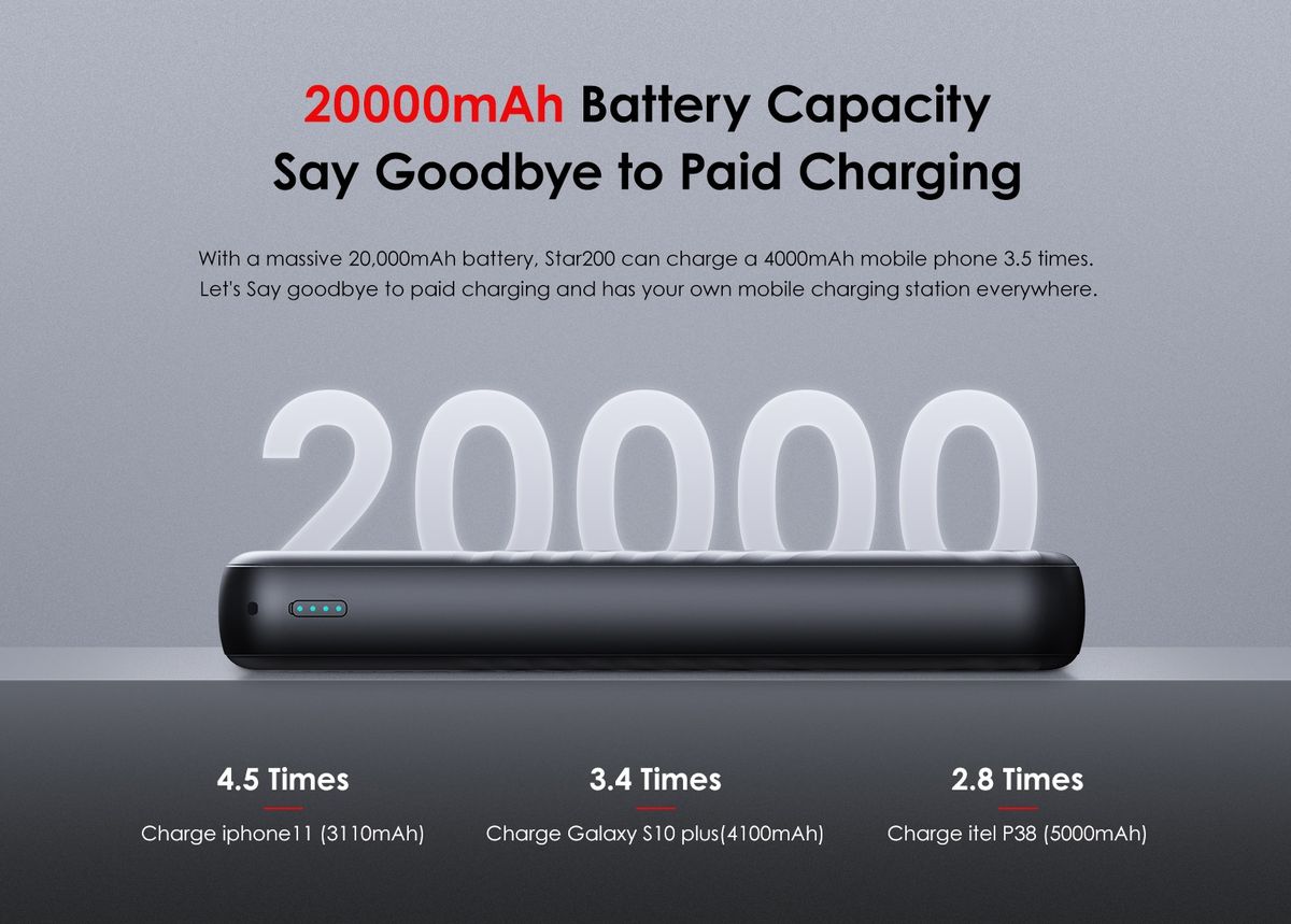 About this item20000mAh battery power bank packs not only for portable charging but also around the home. Allowing you charge mobile devices without having to be tethered to a plug socket. Each of them fully charges 4.2 times for Samsung S10, 4 times for iPhone 11, 2.4 times for iPad mini 5 and 4.6 times for iPhone X.