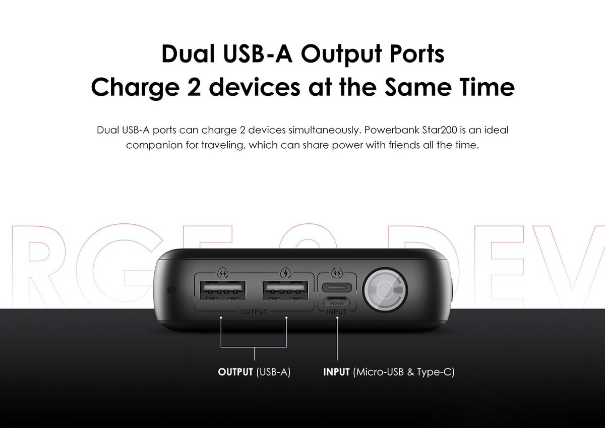 Dual Output & Input: Each has 2 USB output ports that detect all the connected devices and efficiently distributes the current output up to 5V 2.1A. The USB C and Micro USB ports can fully refill the battery itself in 10 hrs at 5V 2.0A.