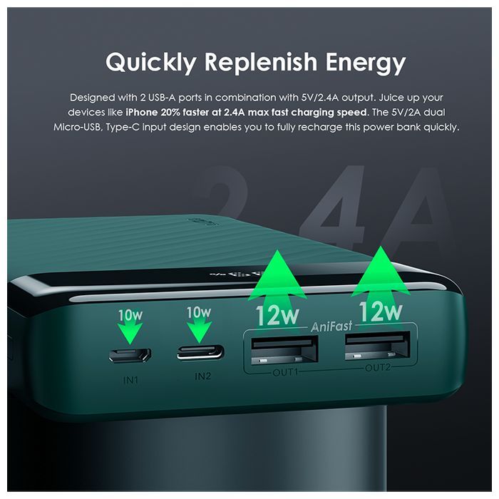 It contains two AniFast fast charging ports and supports dual input and output, which can charge multiple devices at the same time- without sacrificing charging speed.