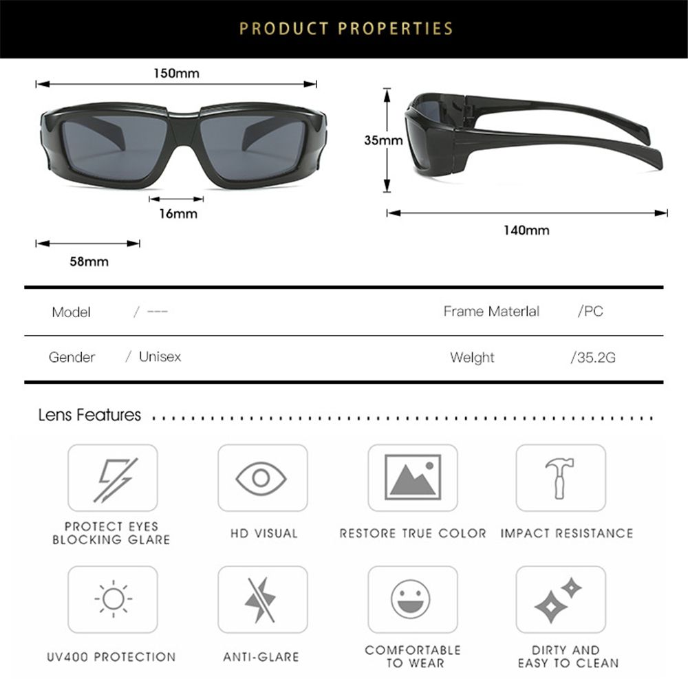 Product Name: 2000'S Sport Sunglaes Style: Y2K Style, Trendy, Retro Fashion Color: 9 Colors for your choice Lens Material: PC Frame Material: PC Lens Features: UV Protection Polarization Type: Non-Polarized Product Size: Total Width: 150mm (5.91inch) Frame Width: 58mm (2.28inch) Frame Height: 35mm (1.38inch) Nose Bridge Width: 16mm (0.63inch) Temples Length: 140mm (5.51inch) Weight: 35.2g (1.24oz) Package Included: 1 x Sunglaes Note: 1. There is a 2-3% difference according to manual measurement. Please check the size carefully before you buy the item. 2. Please note that a slight color difference should be acceptable due to the light and screen.