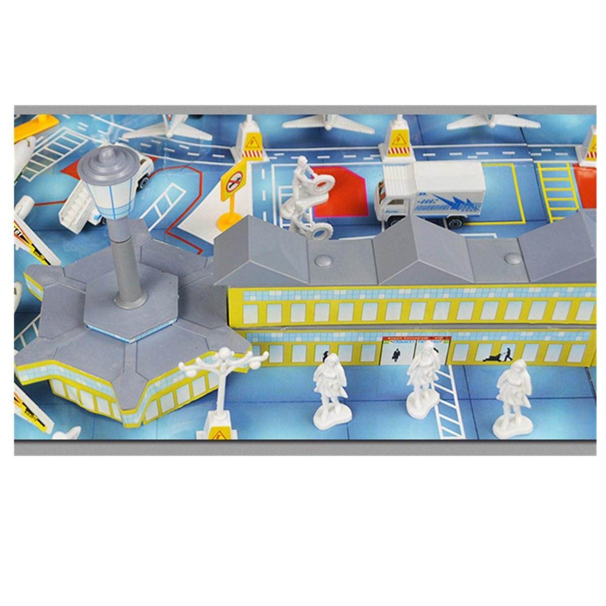 There are the waiting halls, shops, aircrafts, buses, boarding ladder trucks, radars, oil buckets, passengers, traffic wardens, roadblocks, signal lamps, fences, street lamps, traffic signs, cardboard background accessories.