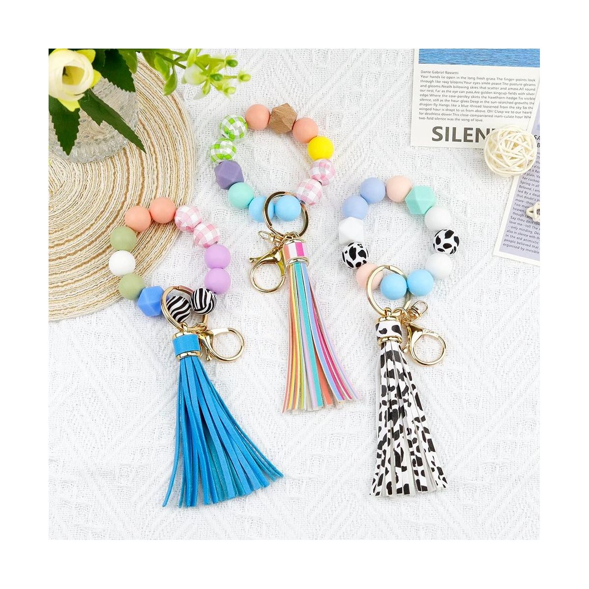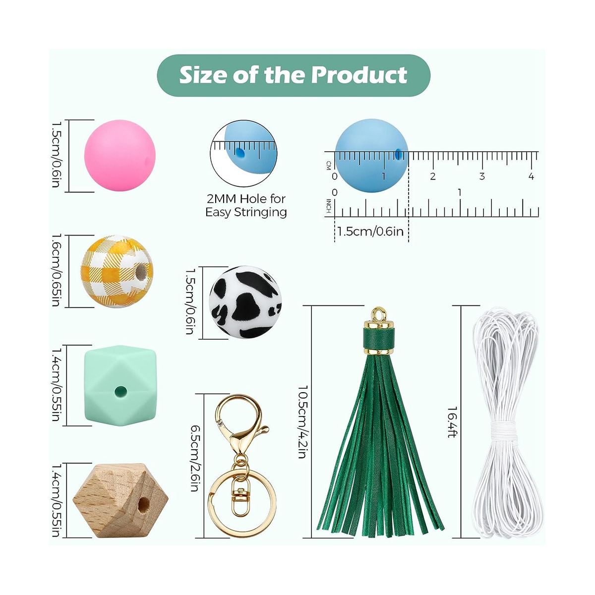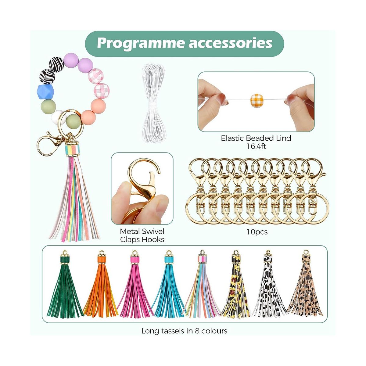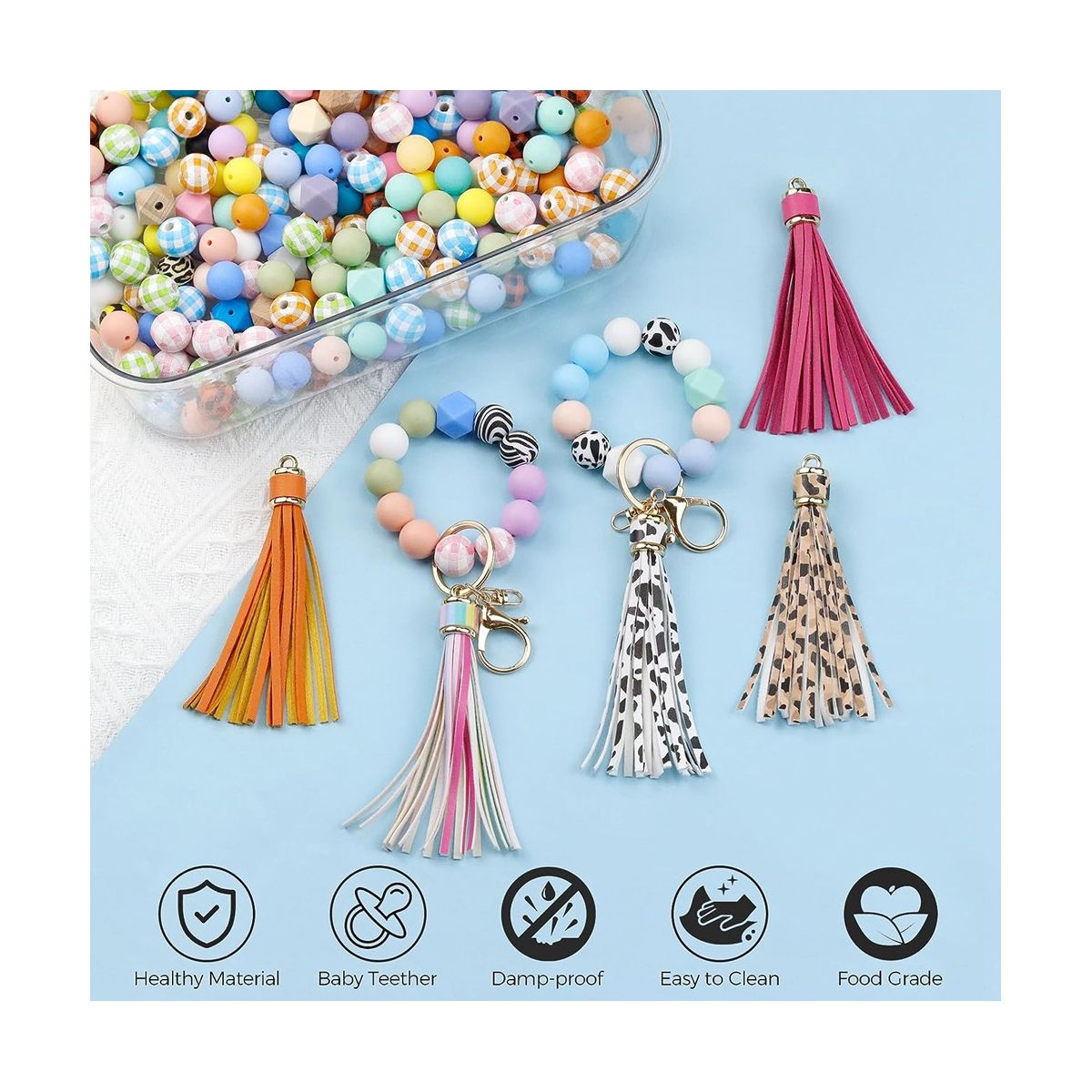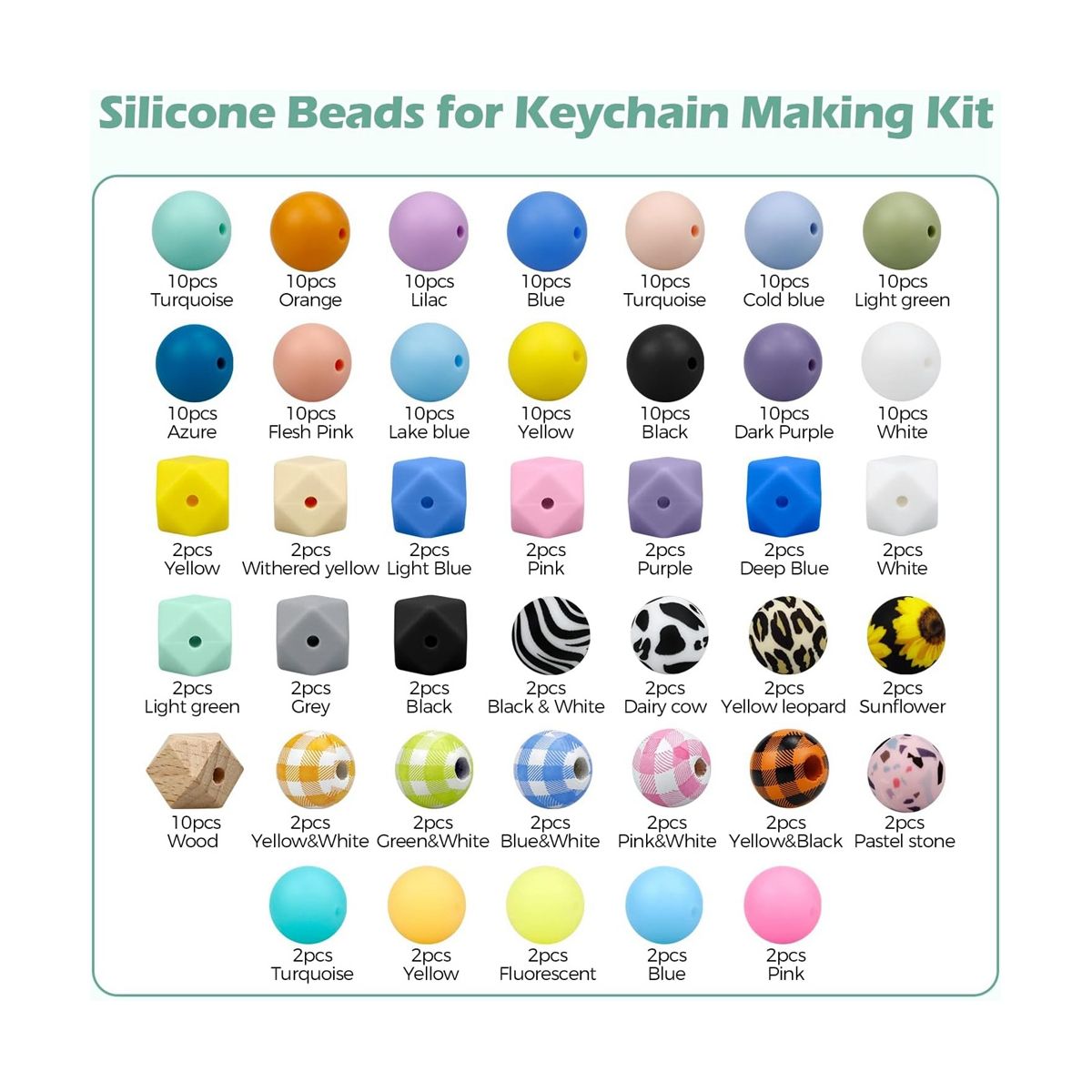 SILICONE BEAD KEYCHAIN MAKING KIT: silicone beads keychain making kits are available in a of styles and shapes of silicone beads.This silicone beads kit include 200pcs silicone beads in 40 colours, 10 metal swivel claps hooks, 8 colours of long tassels, 68 feet of elastic beaded line.These supplies are enough to make a of DIY silicone bead keychains.