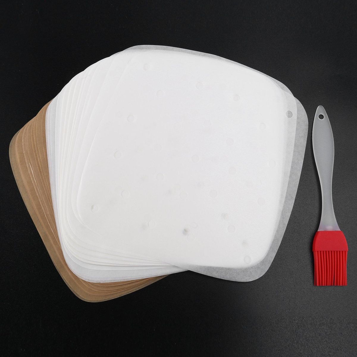 The air fryer parchment liners are made from 100% pulp, it's easy to use, keeps any kind of food at its most perfect looking, this air fryer lining is oil and water resistant, enhancing the texture of your food