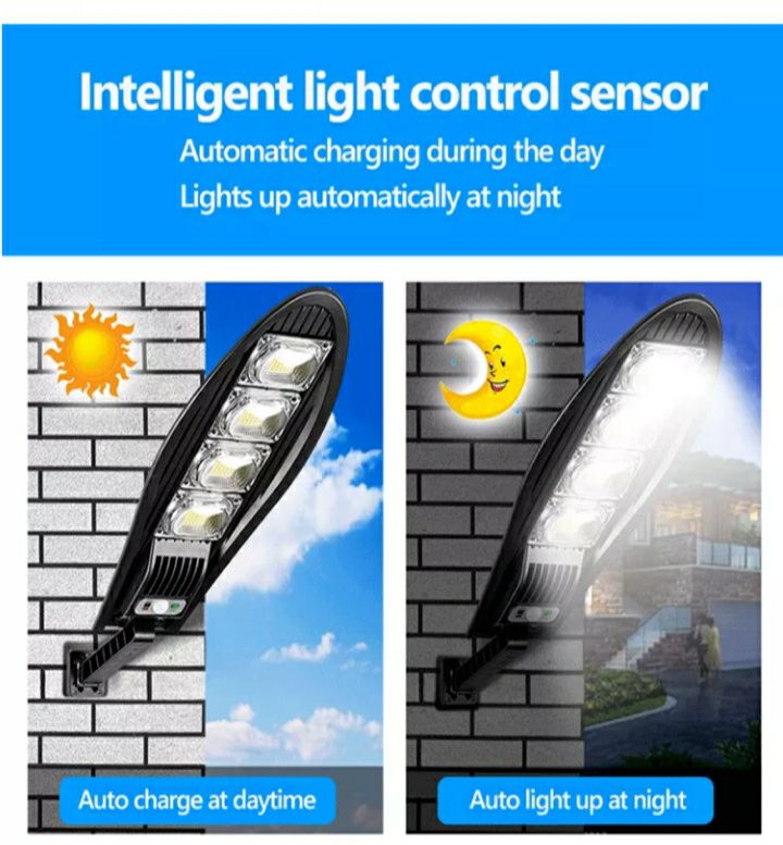 Smart Sensors: Light sensor and smart body sensor, Linear sensing distance can reach 8-12 meters, strong anti-interference. When man come, the sensor will sense the man and turn to the super bright model, when man left, the light will turn into the slight light (half of the bright light).