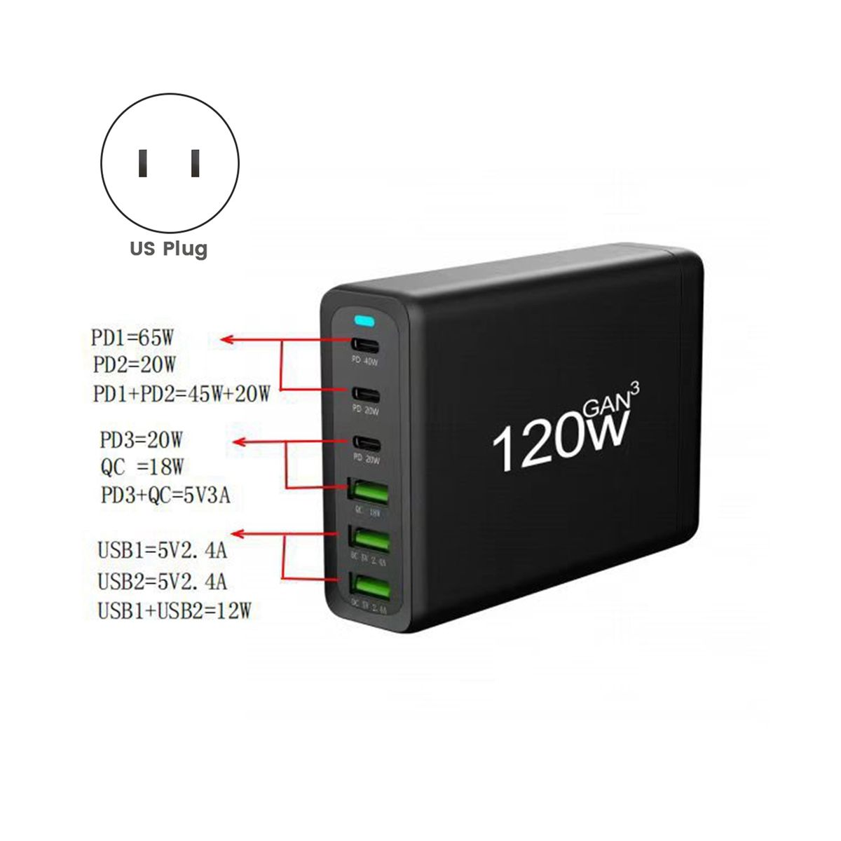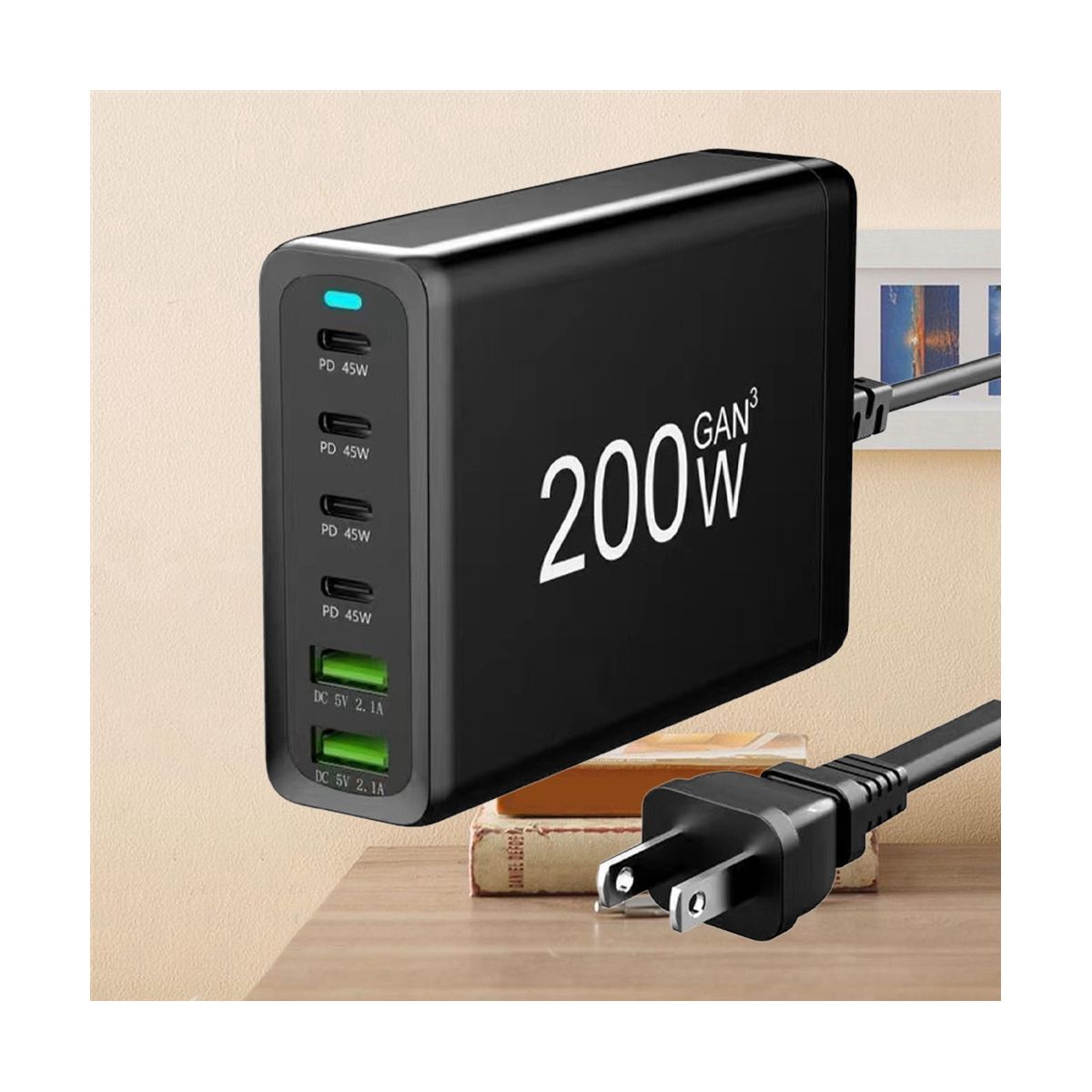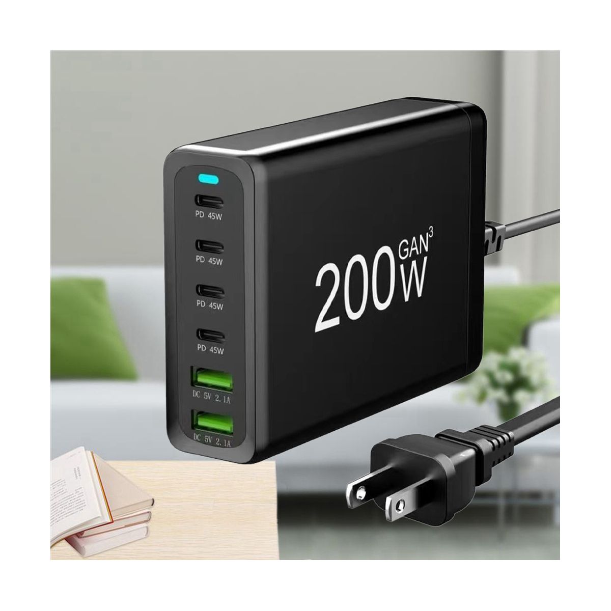 2. Multi-port USB charger shares up to 200W total output with ports and 2 USB-A ports