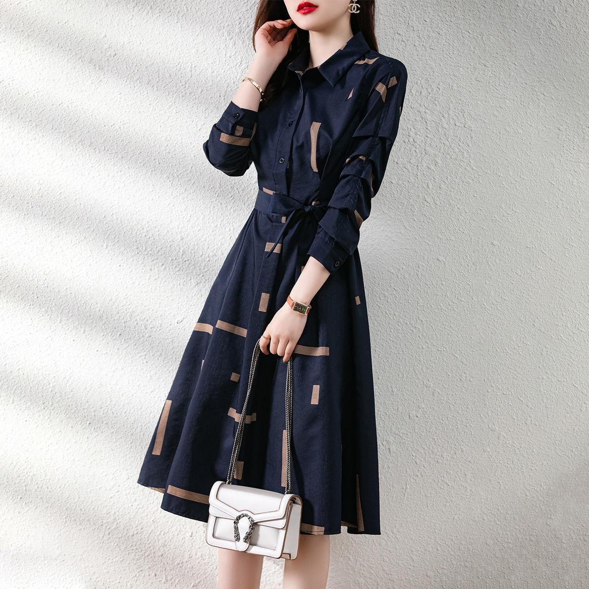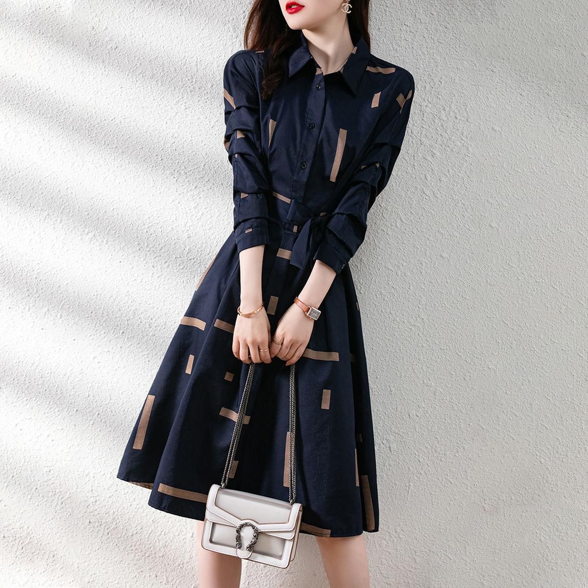 Buy 2021 Spring Dress Temperament Simple Polo Collar Contrast Geometric Belt Slim Shirt Mid length Dress in Nigeria