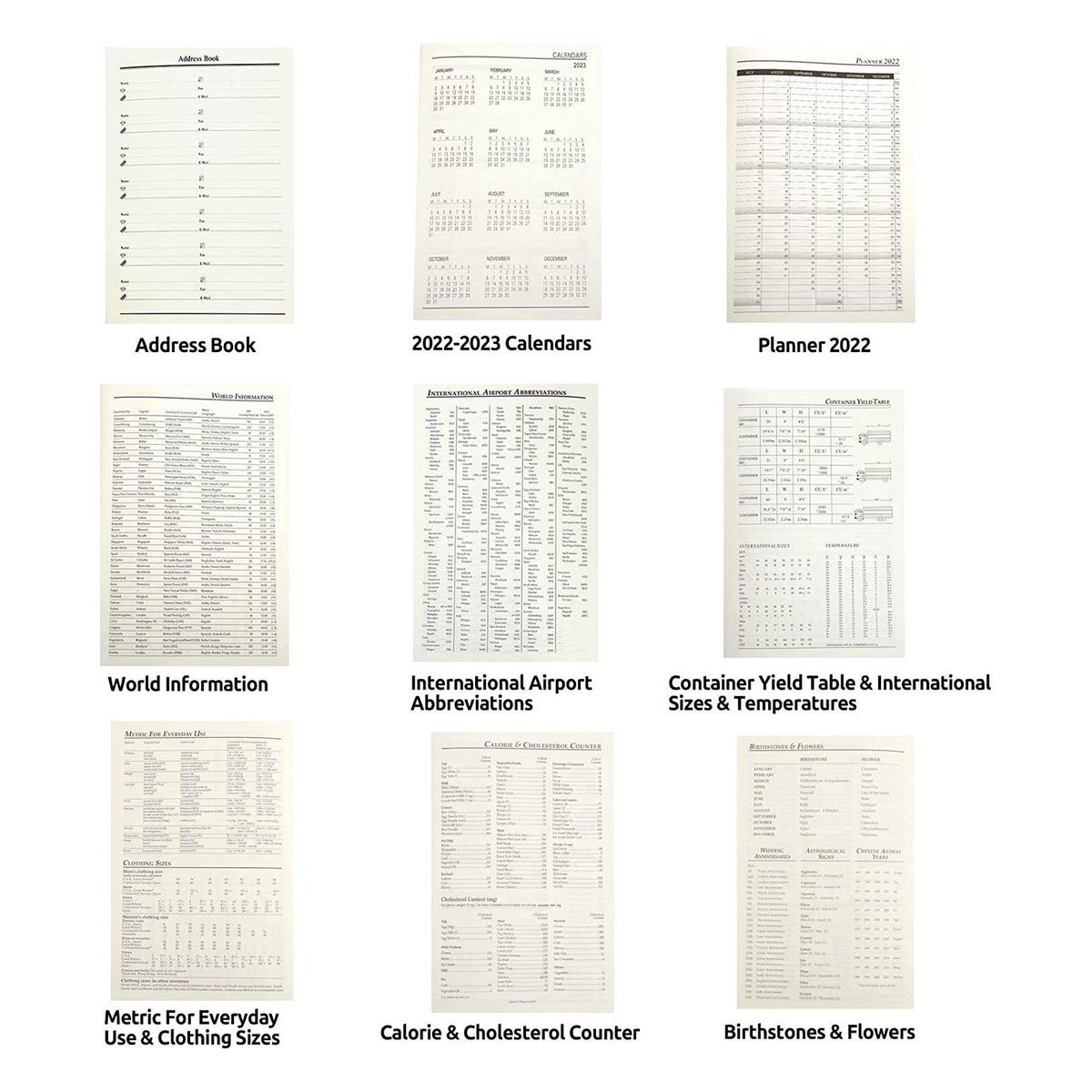 Contents of 2022 Planner Bbook: A5 Planning Pages/ Durable & Soft Cover/ 2022 Calendar Stickers/ 2022-2023 Calendars/ World Information/ International Airport Abbreviations/ Monthly Plan 2022/ Daily Plan/ Address Book